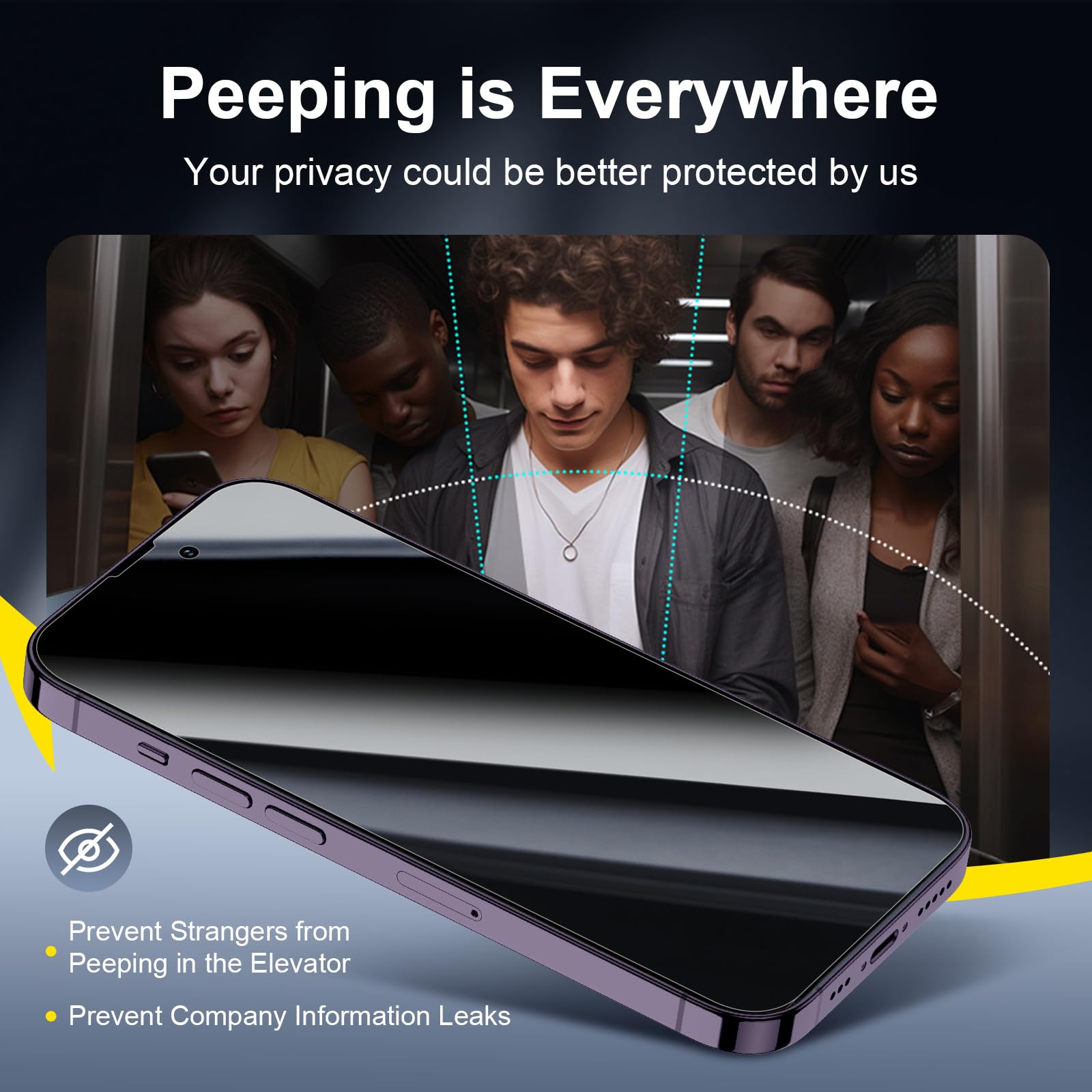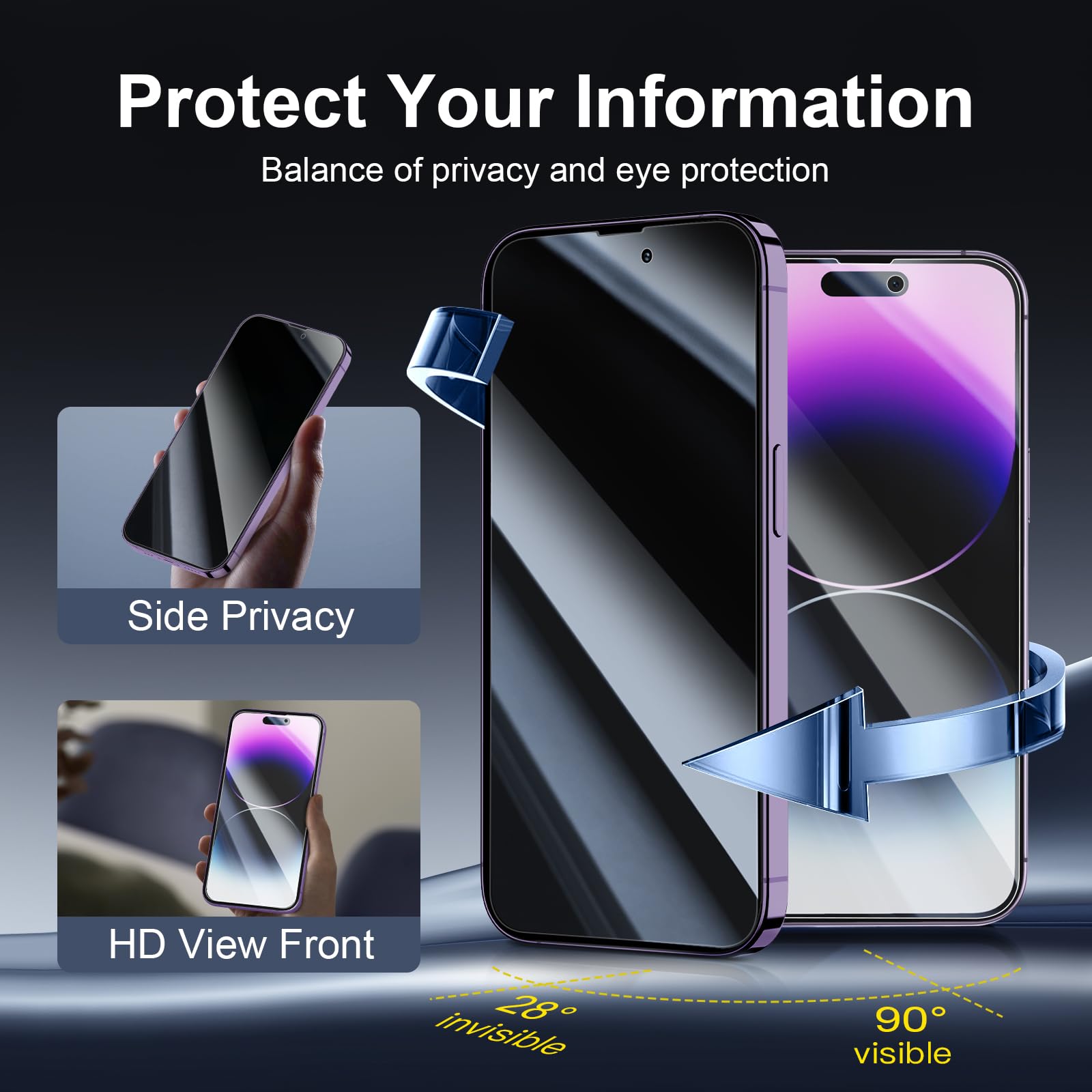 Kit de protection d’écran en verre trempé anti-espion pour iPhone 14 Pro, offrant une confidentialité améliorée et une dureté 9H.