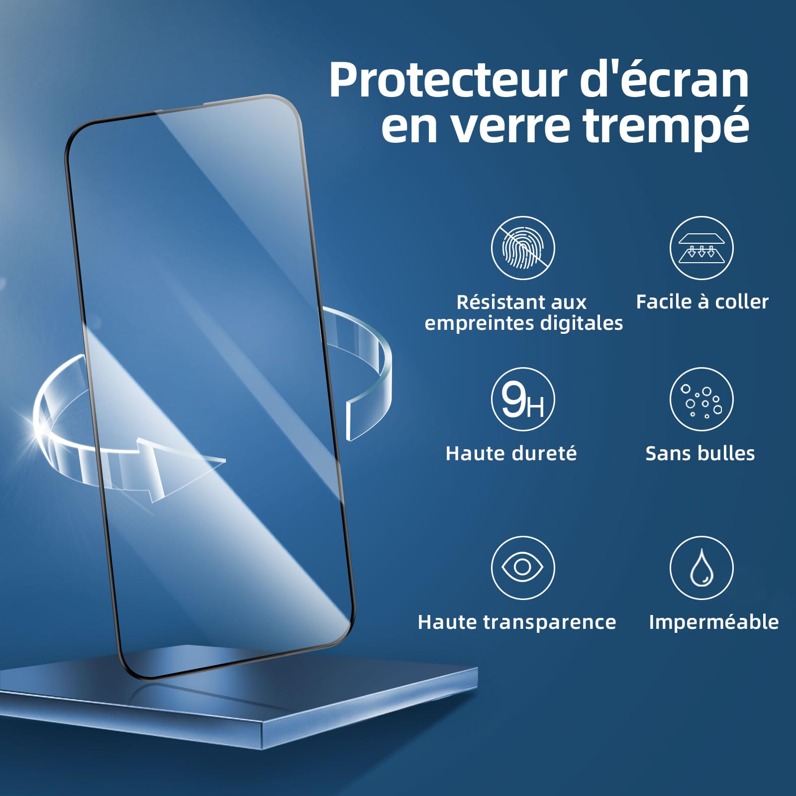 - Lot de 3 Verres Trempés à Couverture Complète au bordure noir pour iPhone 14 Pro Max, iPhone 14 Plus, iPhone 13 Pro Max (6,7 Pouces) avec un cadre de positionnement d’installation rapide. Dureté 9H, résistance aux raillures. Réponse tactile améliorée et super transparent.
