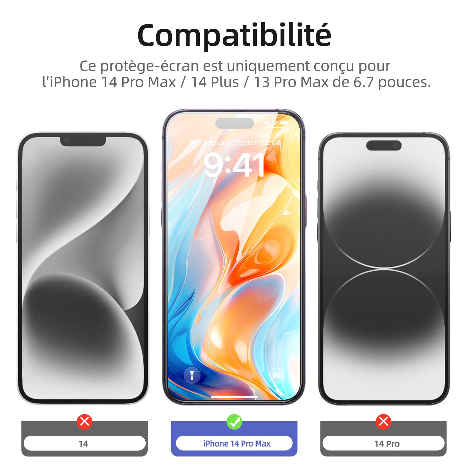 - Protection écran en Verre Trempé iPhone 14 Pro Max, iPhone 14 Plus, iPhone 13 Pro Max (6,7 Pouces). Fabriqué à partir de matériaux de haute qualité pour une durabilité accrue.