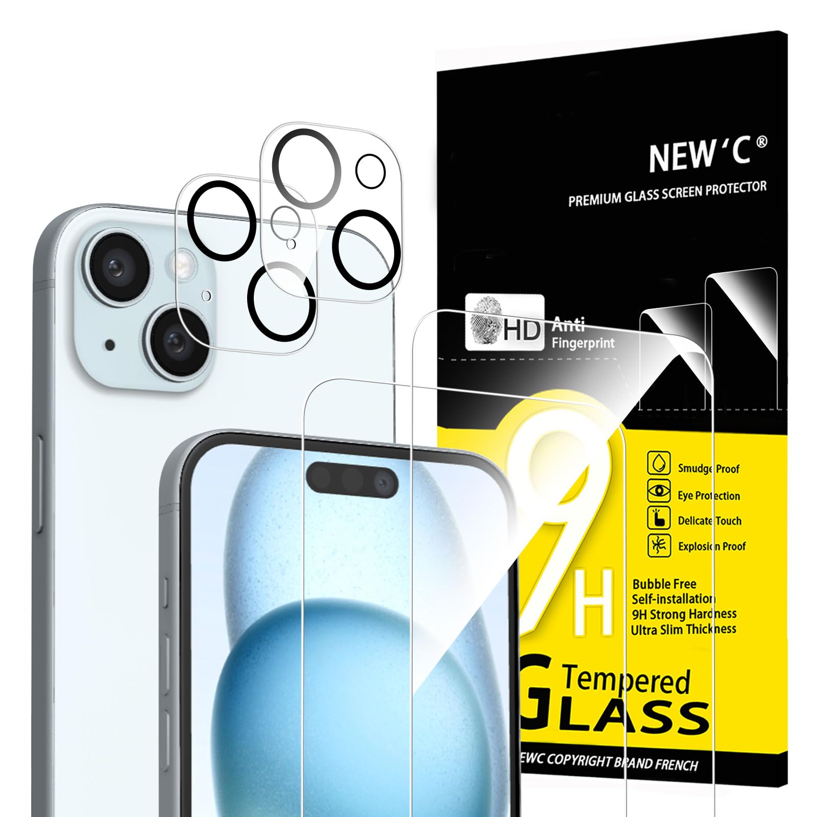 NEW’C Lot de 4, 2 x Verre Trempé pour iPhone 15 Plus (6.7″) et 2 x Protection Caméra Arrière – sans Bulles d’air -Ultra Résistant – Dureté 9H Glass