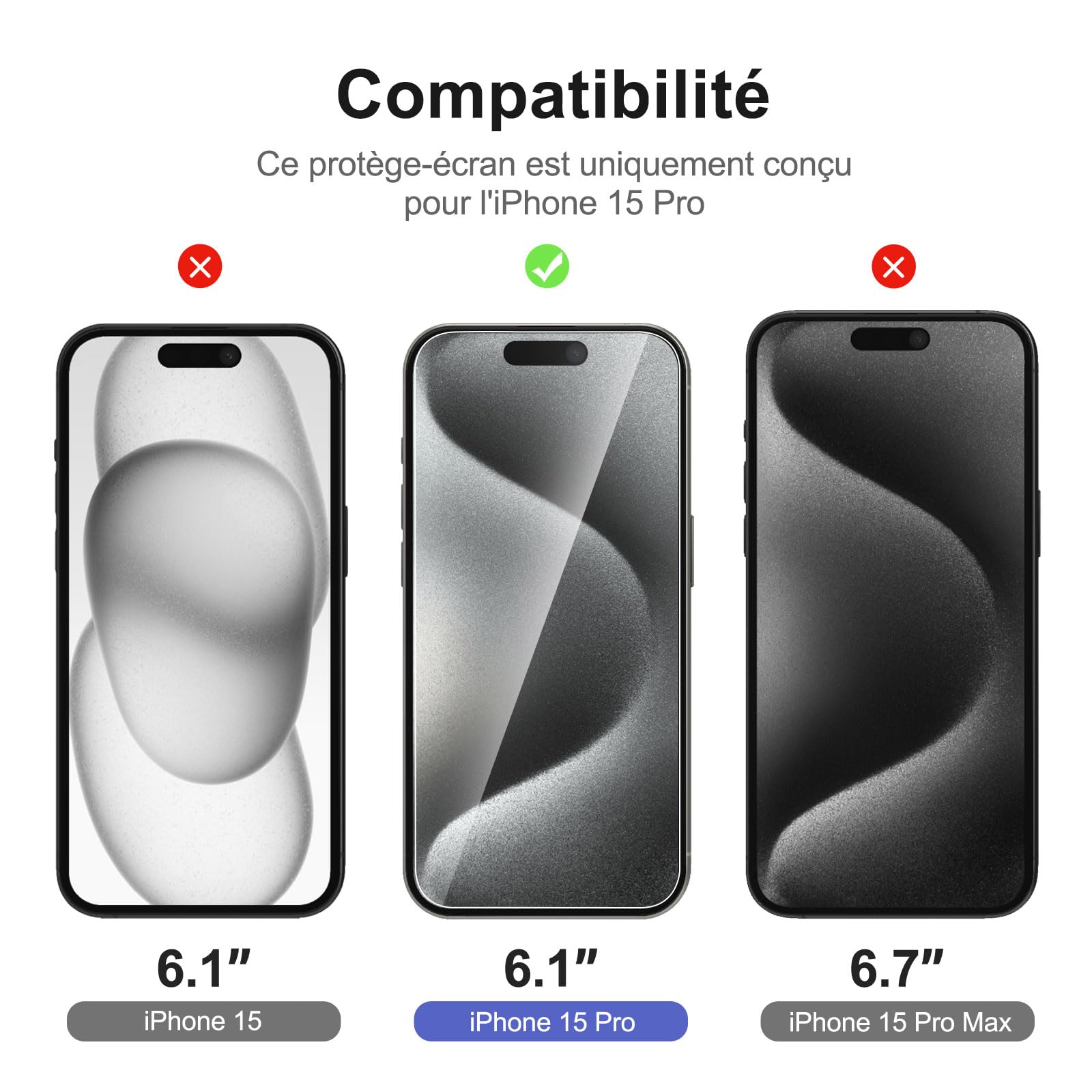 R : Oui, ce Protection d’écran Verre trempé iPhone 15 Pro est parfaitement compatible avec : iPhone 15 Pro.