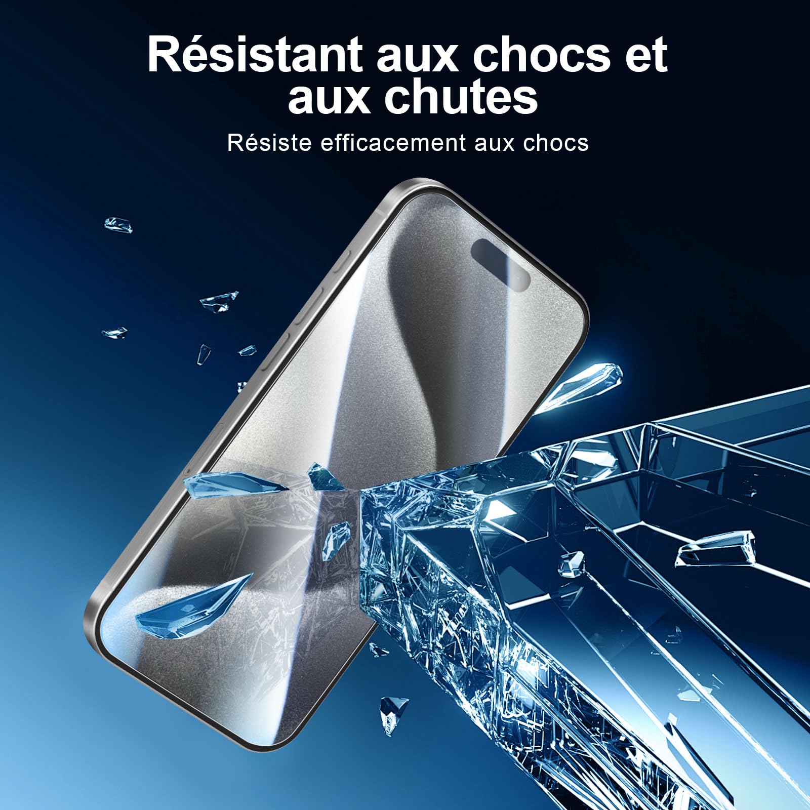 Protection d’écran en verre trempé pour iPhone 15 Pro, offrant une protection ultra-résistante et une installation facile.