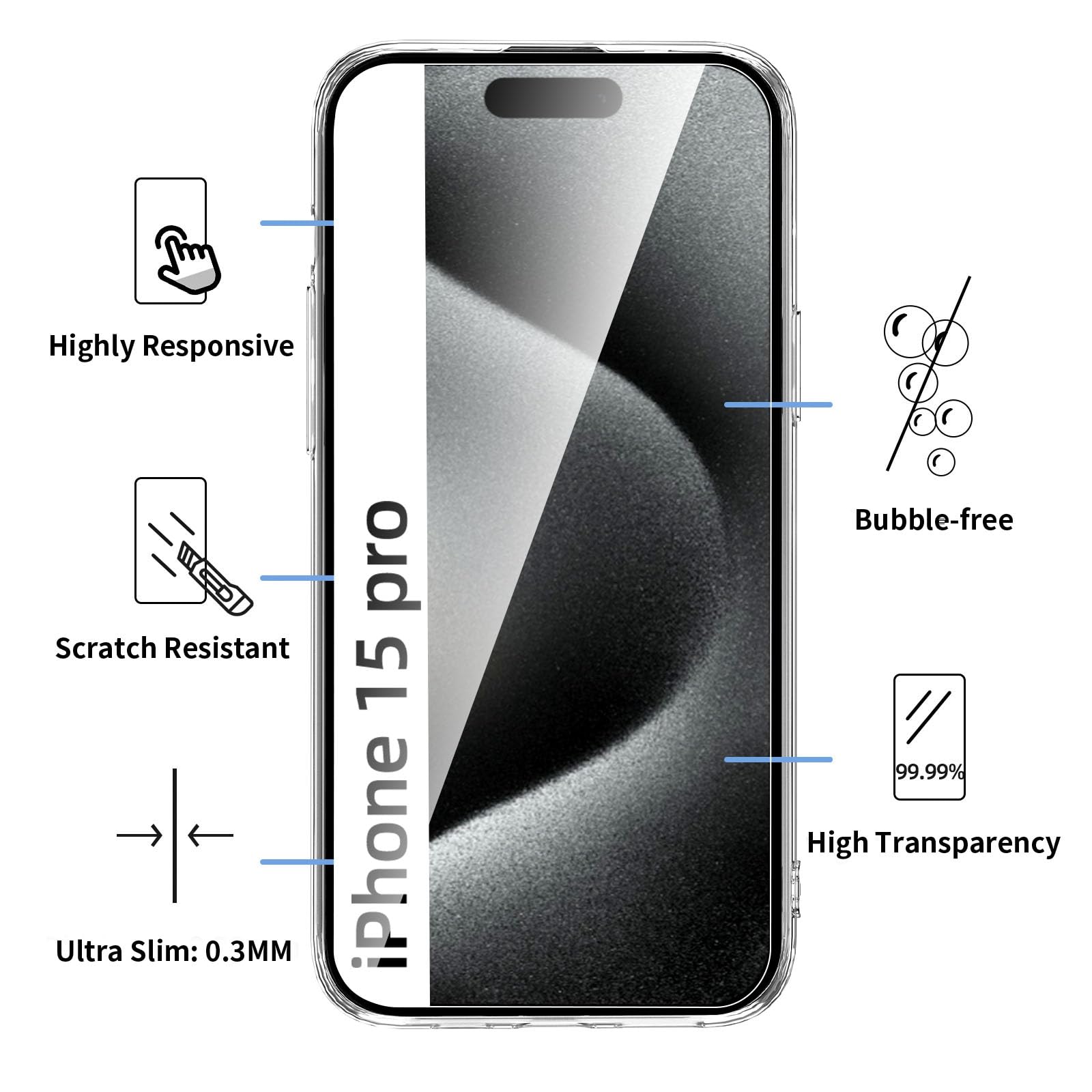 Protection d’écran en verre trempé et coque en silicone pour iPhone 15 Pro, offrant une protection maximale avec une transparence élevée et une résistance aux rayures.