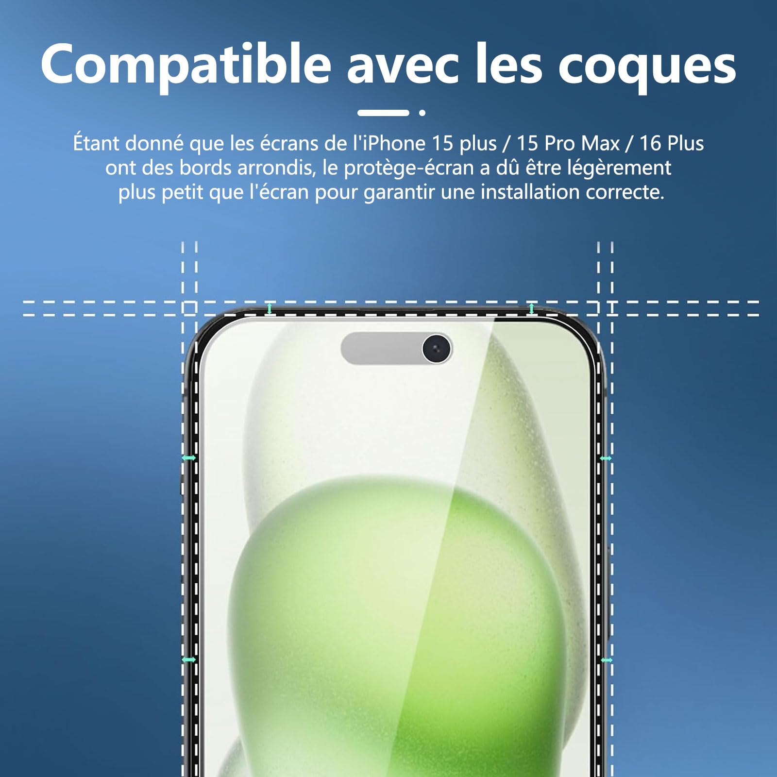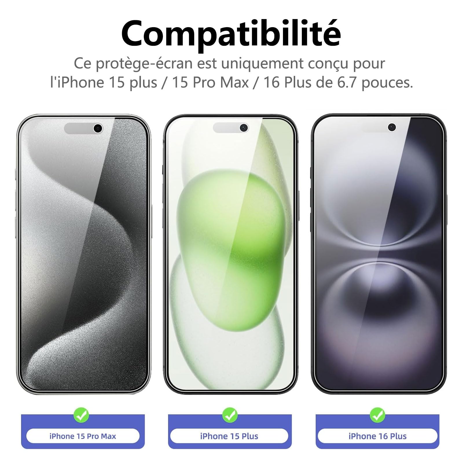 R : Oui, ce Protection d’écran Verre trempé iPhone 16 / iPhone 15 / iPhone 15 Pro est parfaitement compatible avec : iPhone 16, iPhone 15, iPhone 15 Pro.