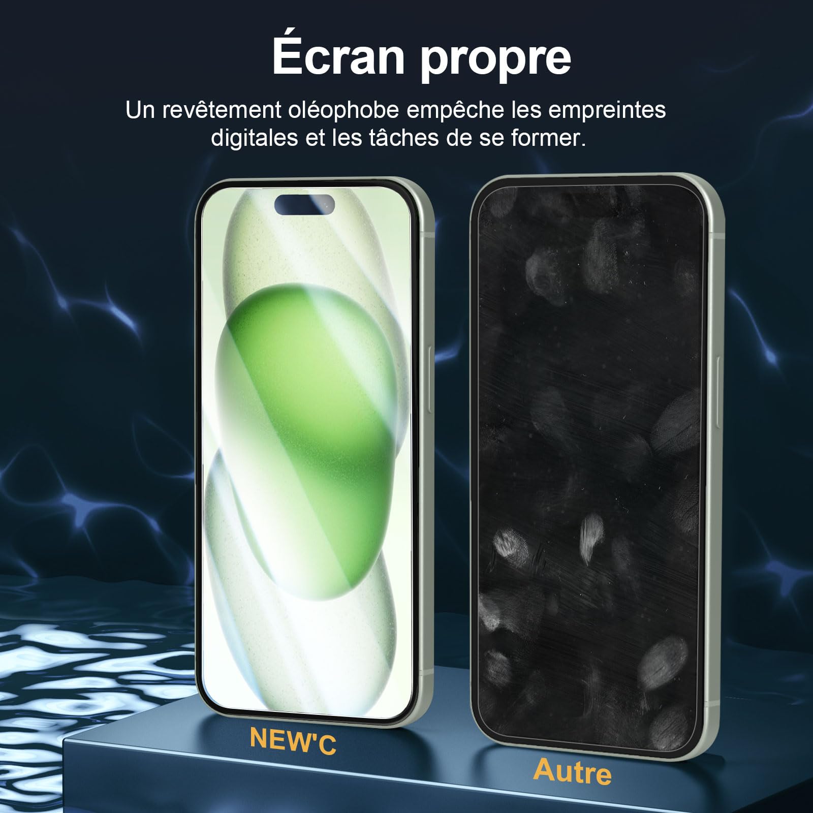 • NEW’C Protection écran en Verre Trempé iPhone 16 Plus,iPhone 15 Plus (6,7 Pouces). Sensibilité tactile conservée : un revêtement adhésif de silicium qui rend l’installation facile et durable tout en préservant les qualités tactiles du téléphone.
