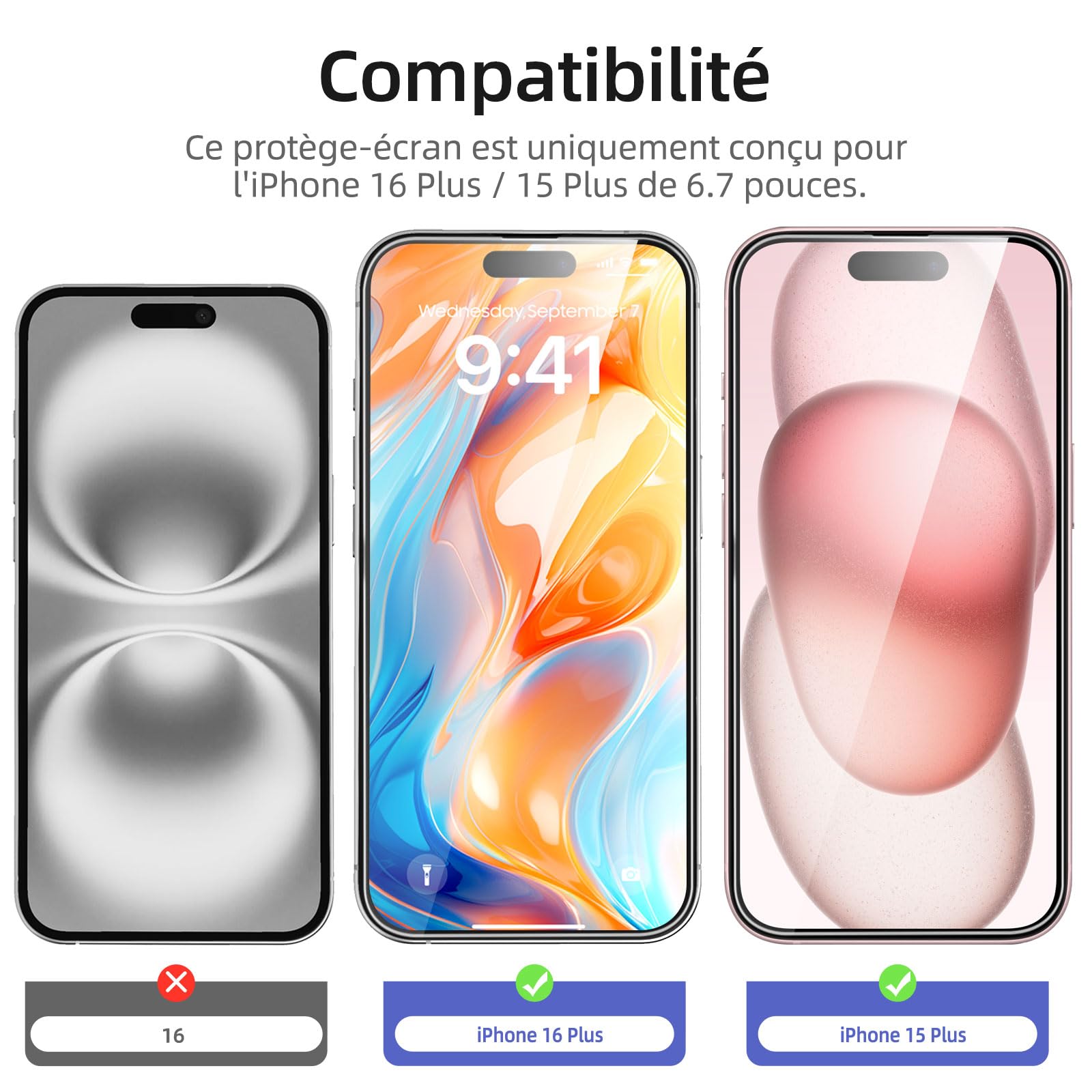 R : Oui, ce Protection d’écran Verre trempé iPhone 16 Plus / iPhone 15 Plus est parfaitement compatible avec : iPhone 16 Plus, iPhone 15 Plus.