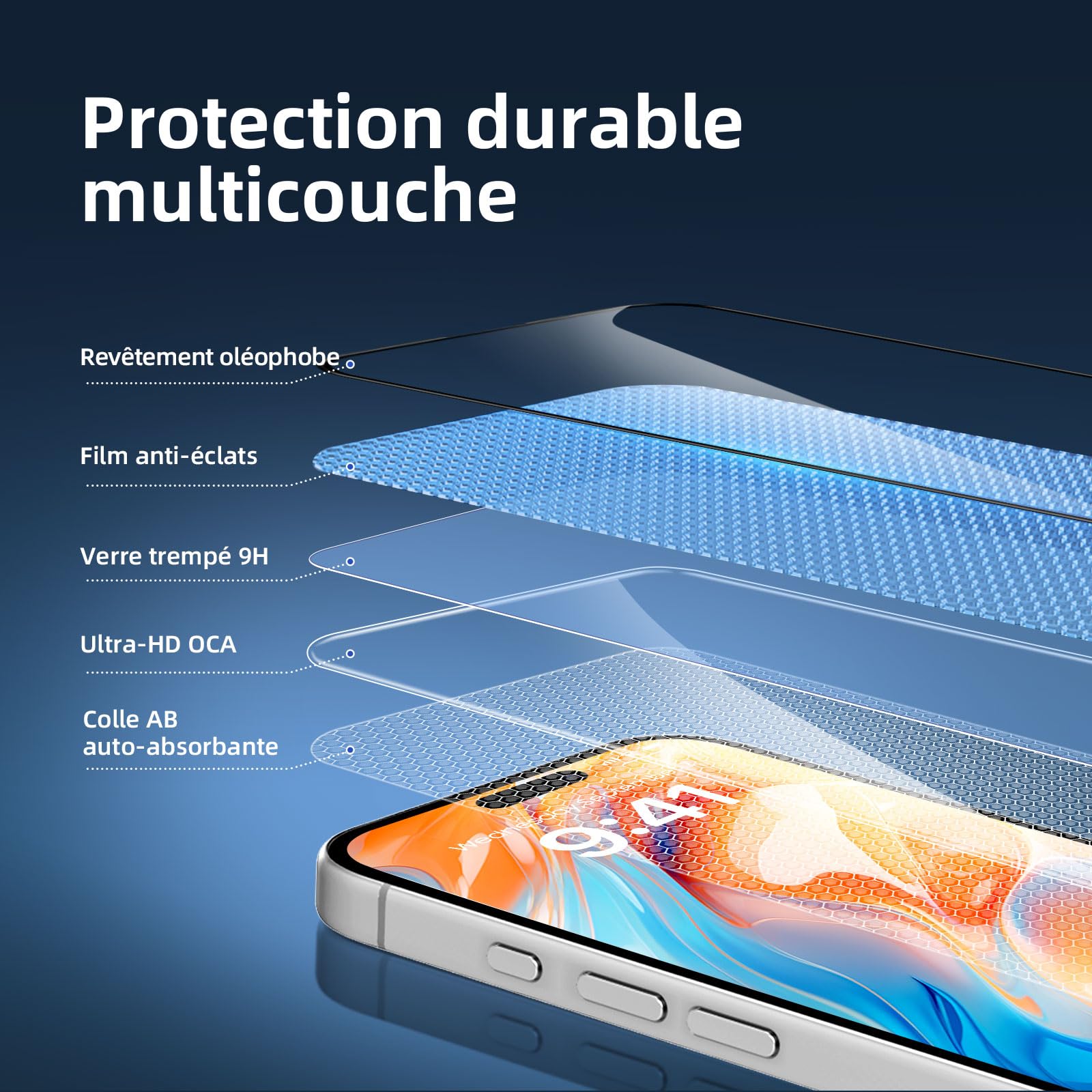 - Alignement automatique : Livré avec un cadre de positionnement ou des outils d’aide, pour un alignement facile avec l’écran. Adhésion automatique : Il suffit de le poser doucement, il se colle tout seul sans pression. Gain de temps et d’effort : Manipulation simple, en quelques secondes c’est fait, avec peu de risques de bulles d’air.