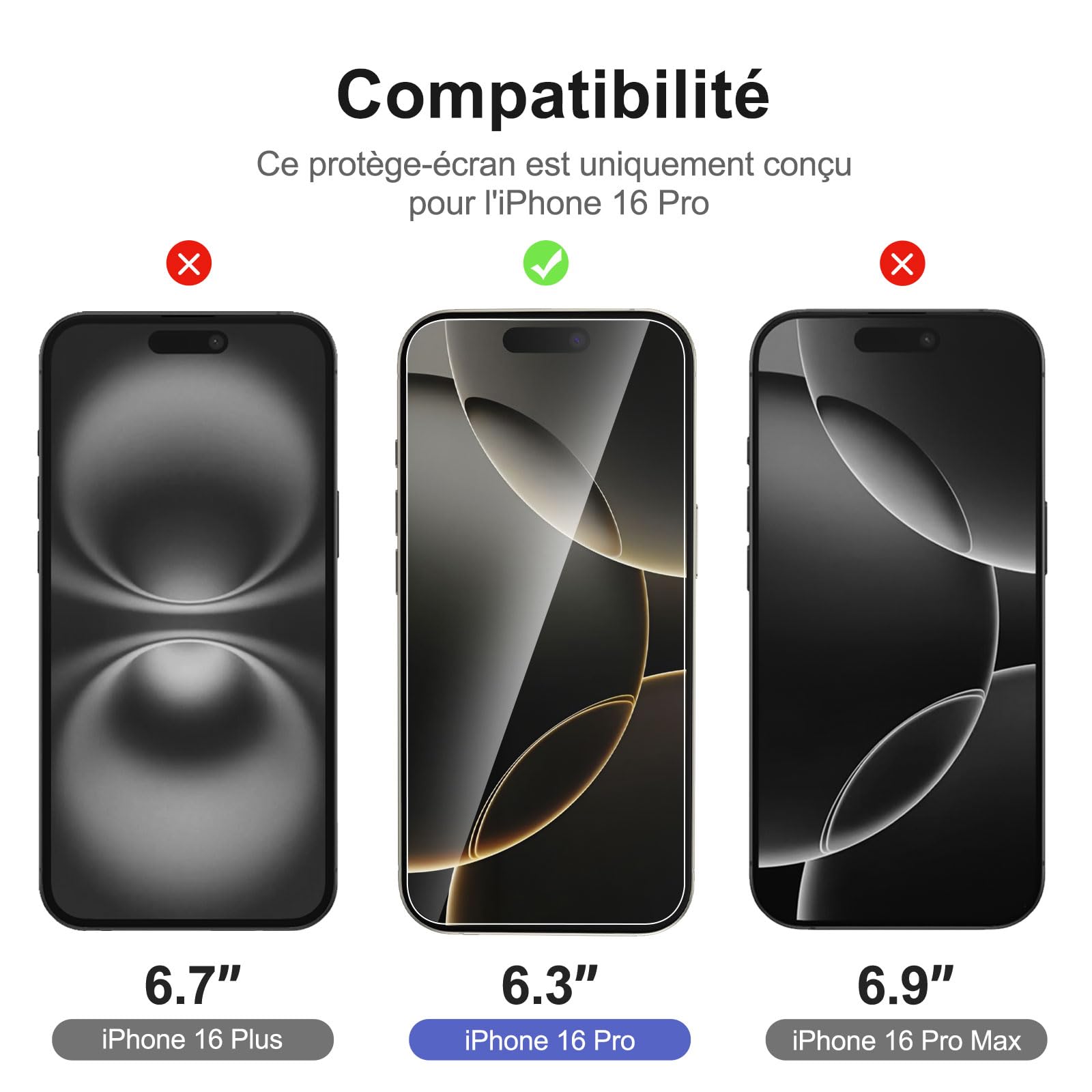 - Contenu : 3* Verre Trempé écran Protecteur, 3* Caméra Lentille Protecteur pour iPhone 16 Pro (6,3 Pouces) et un outil d’installation facile et un Bouchon Anti-Poussière. Une double protection avant et arrière du téléphone.