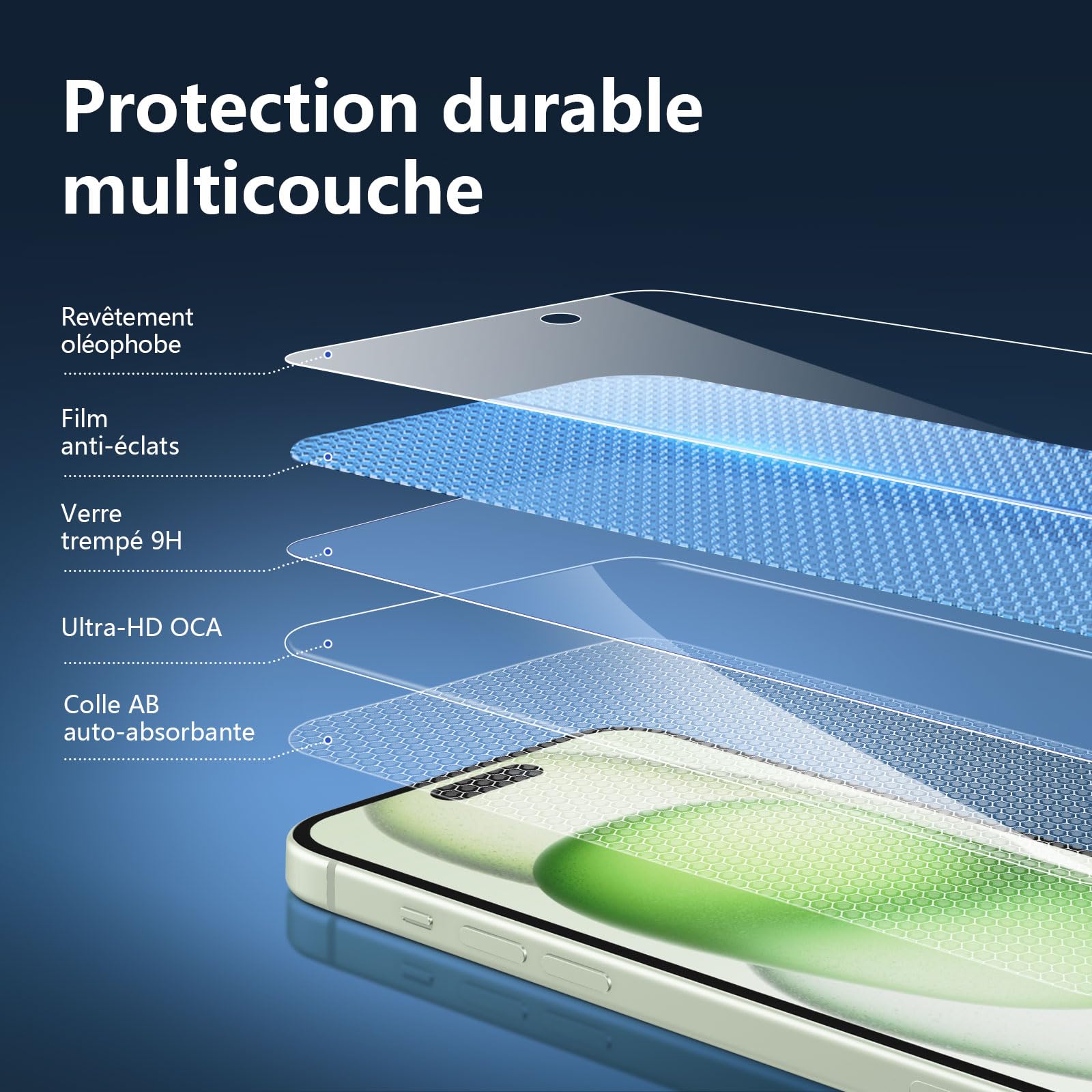 • Installation sans poussière, sans empreintes digitales, facile d’une simple pression, sans bulles. Oléophobe: un revêtement qui empêche les empreintes digitales et d’autres contaminants et rend le verre très facile à nettoyer.