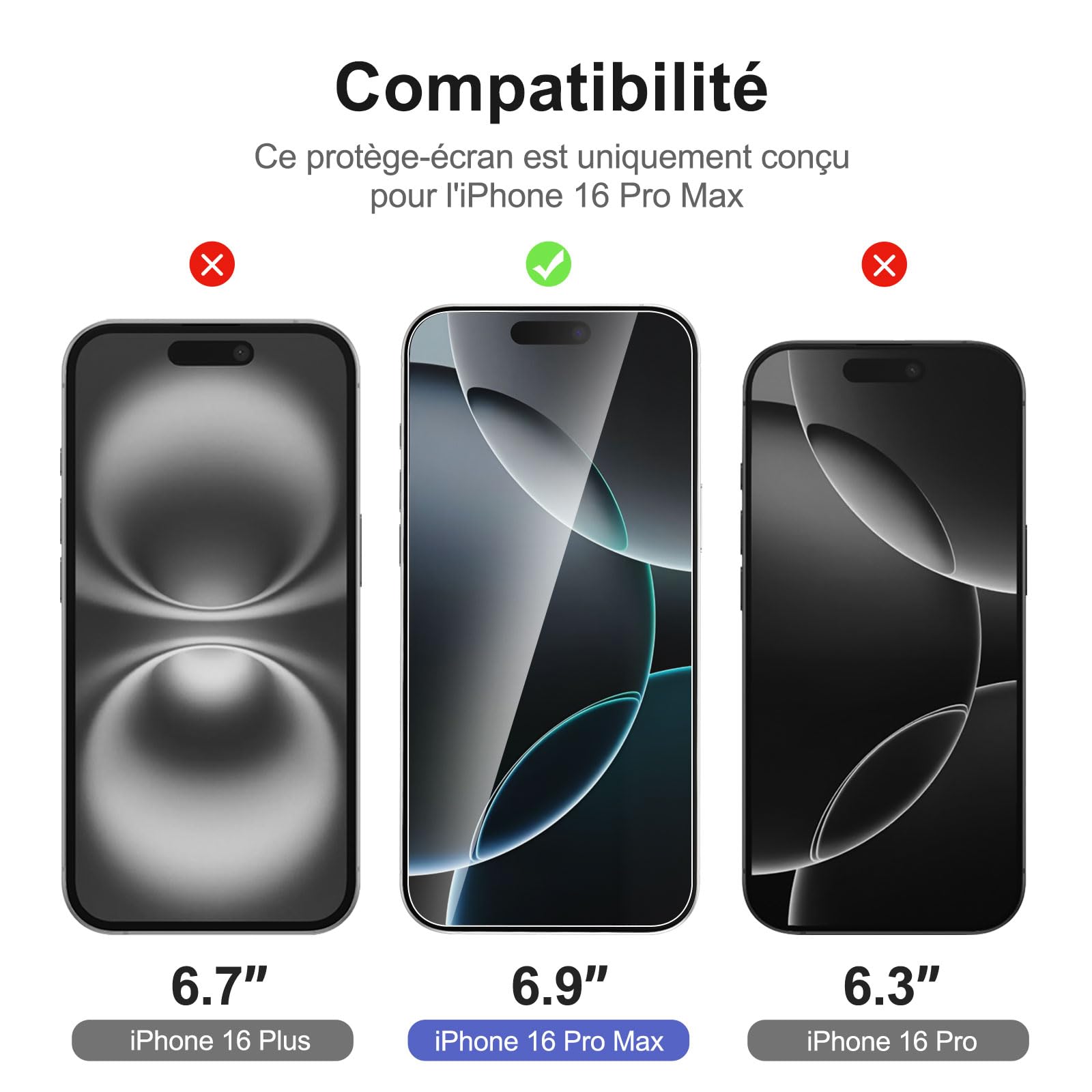 - Contenu : 3* Verre Trempé écran Protecteur pour iPhone 17 Pro Max, iPhone 16 Pro Max (6,9 Pouces) et un outil d’installation facile. Dureté 9H, résistance aux raillures. Réponse tactile améliorée et super transparent.
