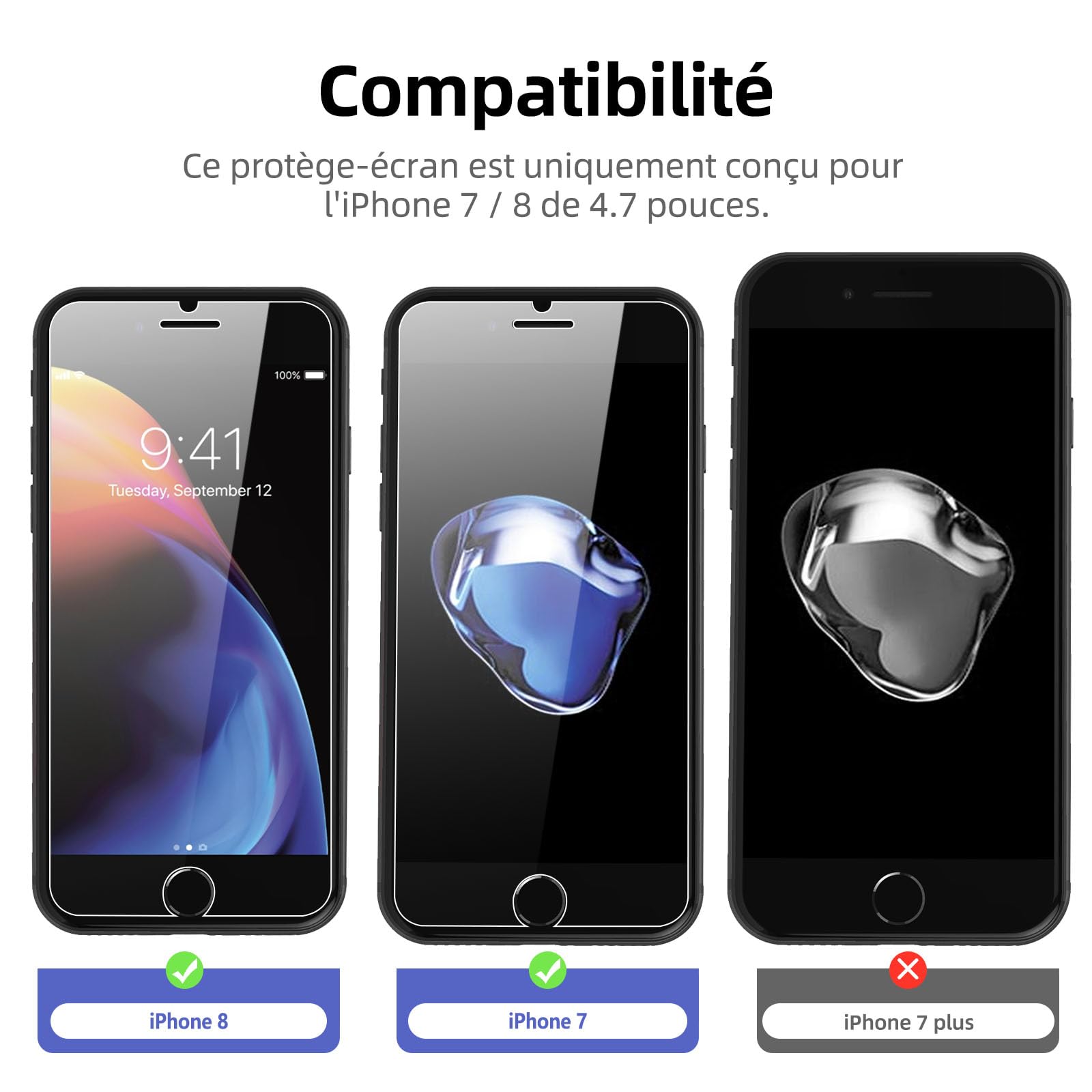 R : Oui, ce Protection d’écran Verre trempé iPhone 8 / iPhone 7 est parfaitement compatible avec : iPhone 8, iPhone 7.