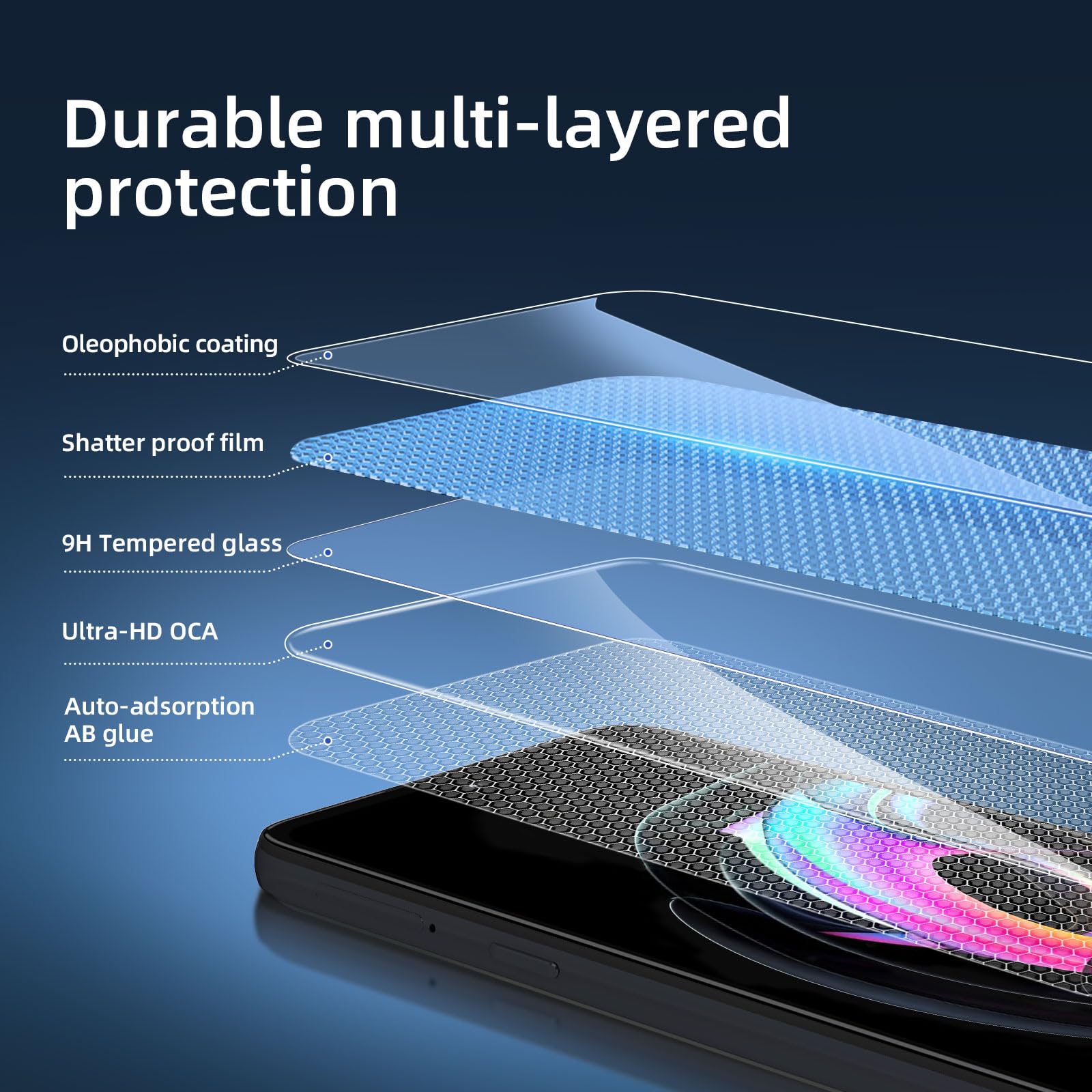- Installation sans poussière, sans empreintes digitales, facile d’une simple pression, sans bulles.Oléophobe: il a un revêtement oléophobique qui empêche les empreintes digitales et d’autres contaminants et rend le film facile à nettoyer.