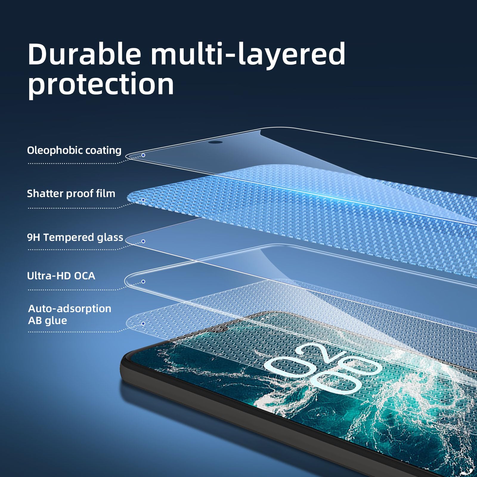 - Installation sans poussière, sans empreintes digitales, facile d’une simple pression, sans bulles.Oléophobe: il a un revêtement oléophobique qui empêche les empreintes digitales et d’autres contaminants et rend le film facile à nettoyer.