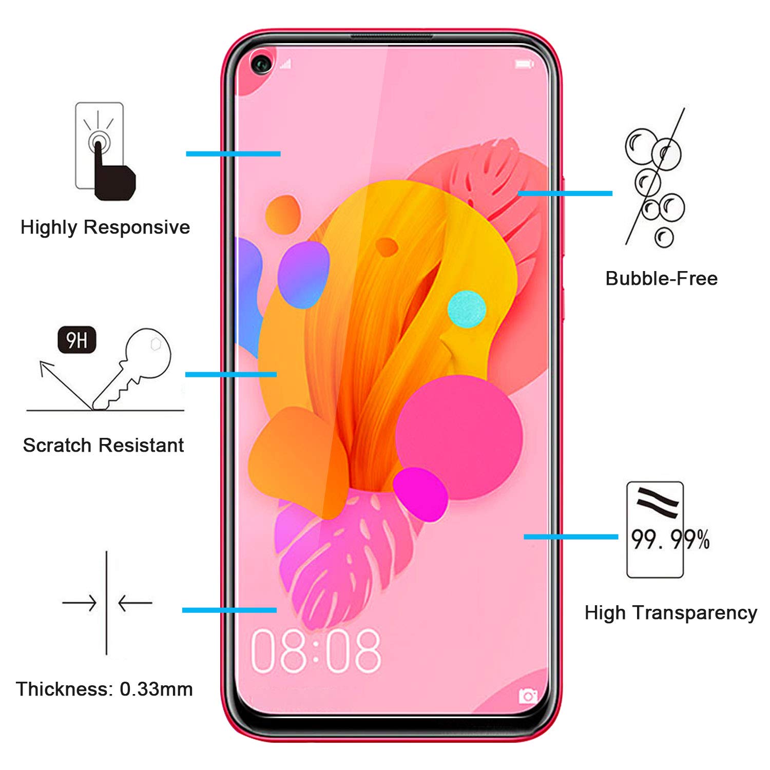 Protection d’écran en verre trempé pour Huawei Nova 5i et Nova 6 SE, offrant une dureté de 9H, une épaisseur de 0,33 mm, et une transparence HD ultra claire.