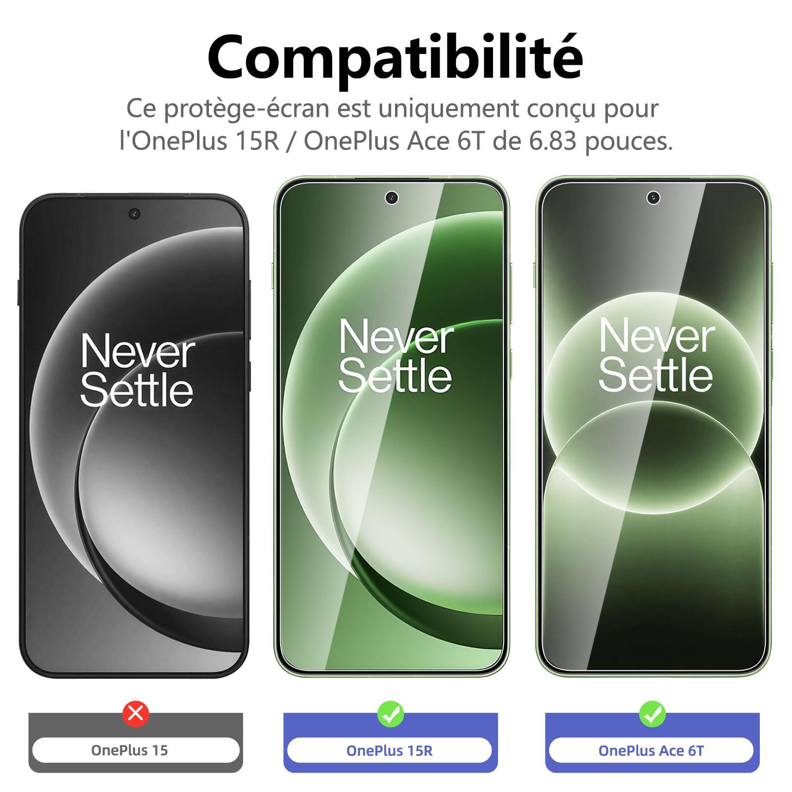 R : Oui, ce Protection d’écran Verre trempé OnePlus 15R / OnePlus Ace 6T est parfaitement compatible avec : OnePlus 15R, OnePlus Ace 6T.