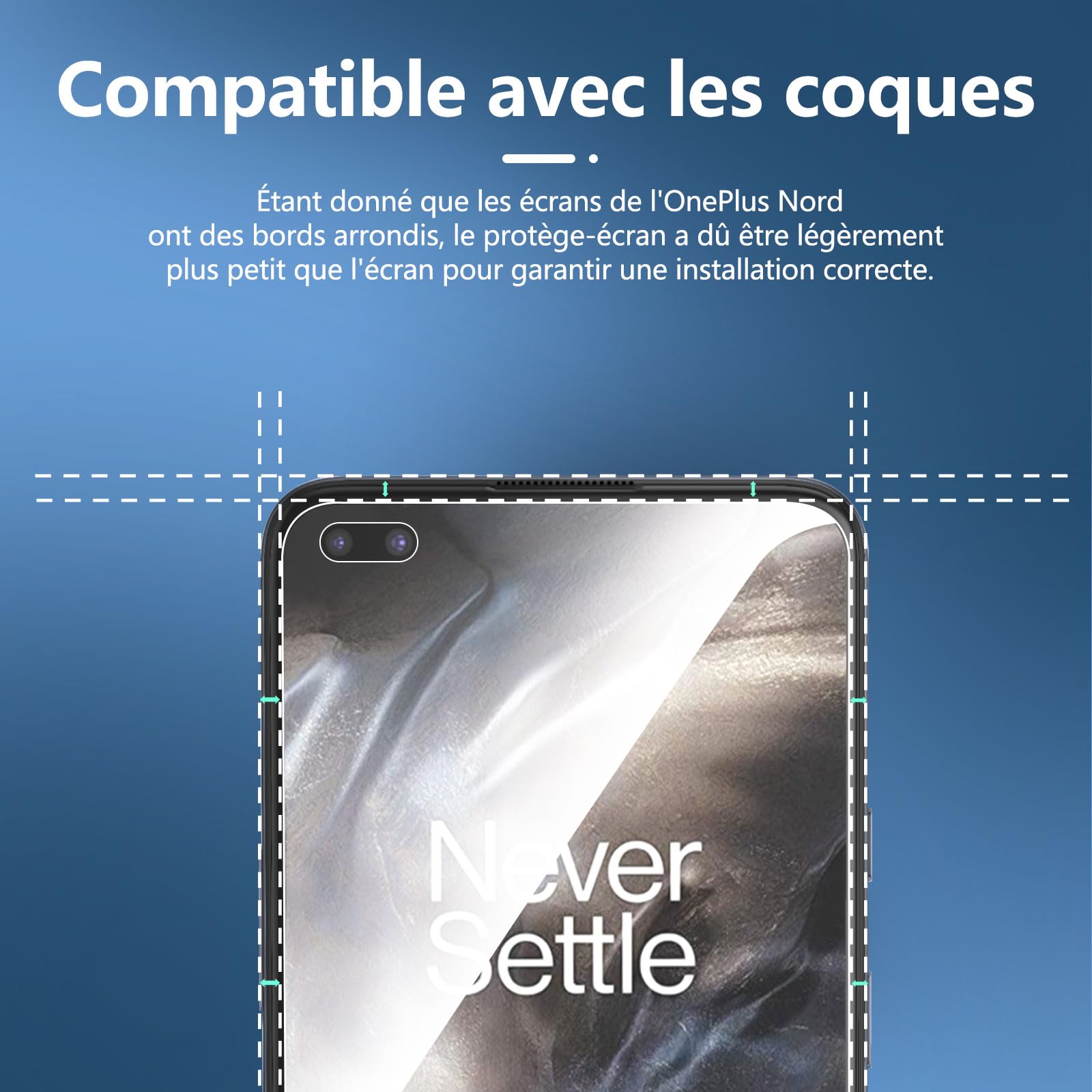 - Remarque: C’est parce que l’écran de OnePlus Nord est avec les bordures incurvés, donc le protecteur ne recouvre pas complètement l’écran, mais seulement la zone plate.