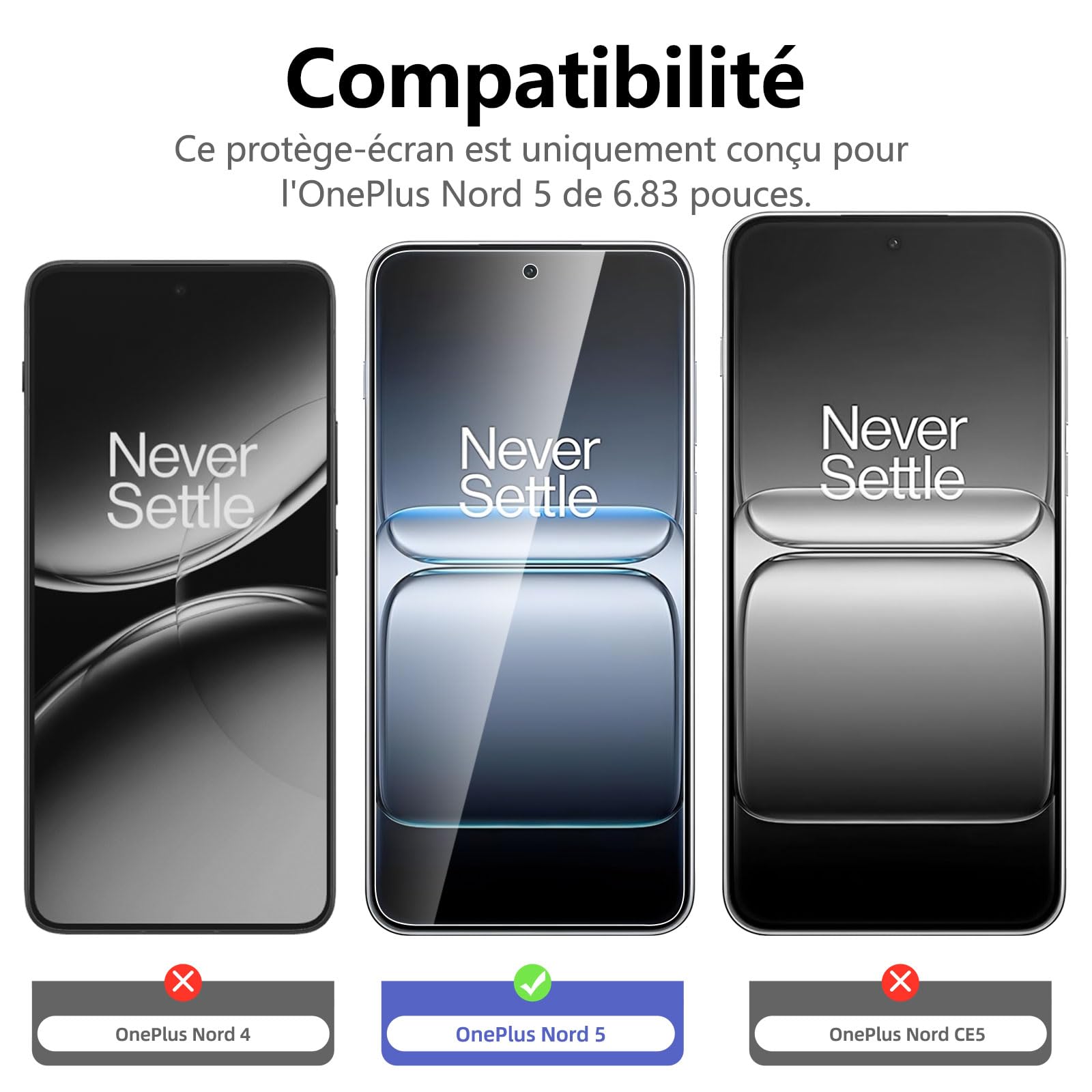 R : Oui, ce Protection d’écran Verre trempé OnePlus Nord 5 est parfaitement compatible avec : OnePlus Nord 5.