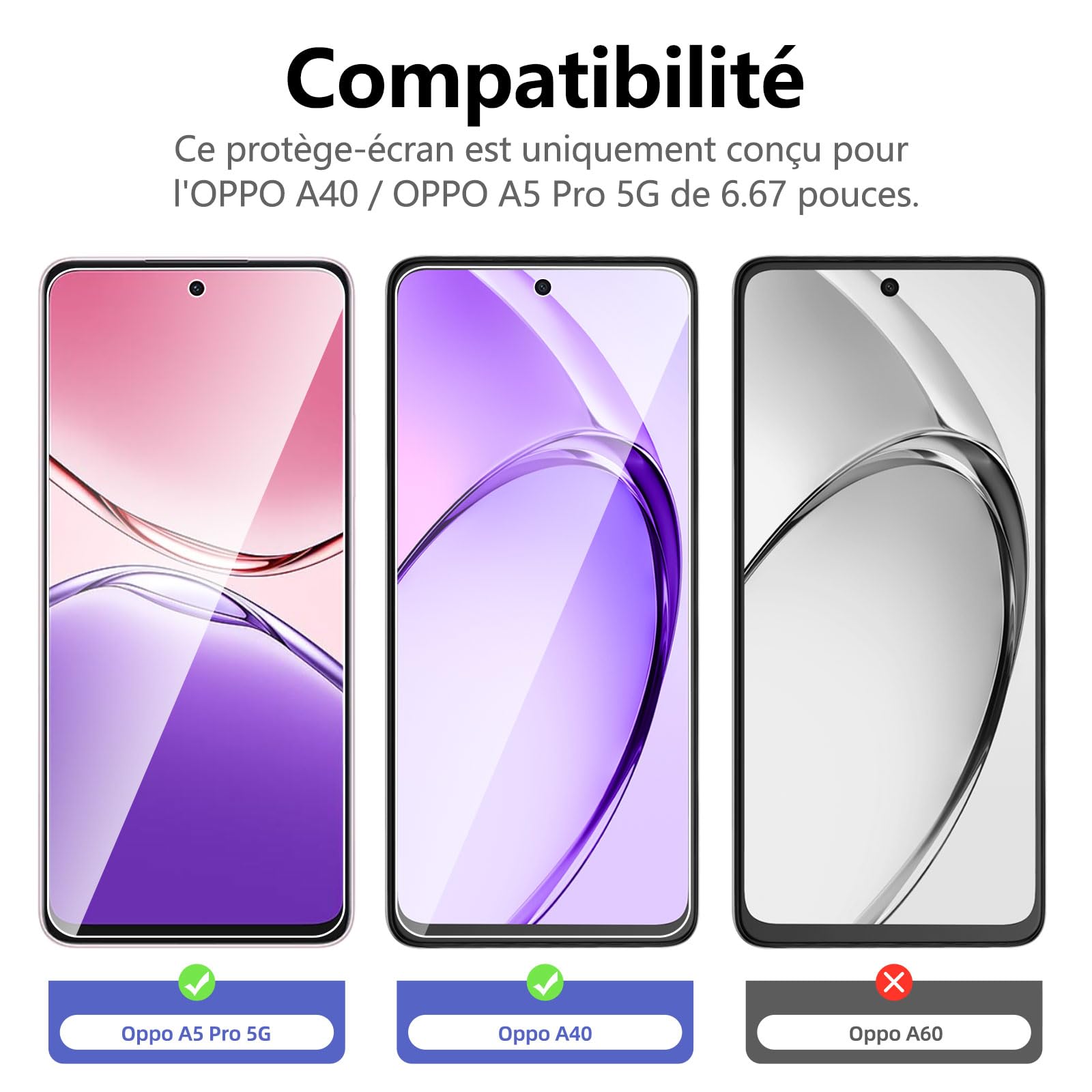 Protection d’écran en verre trempé pour OPPO A40 et OPPO A5 Pro 5G, offrant une dureté de 9H, une installation sans bulles, et une transparence HD.