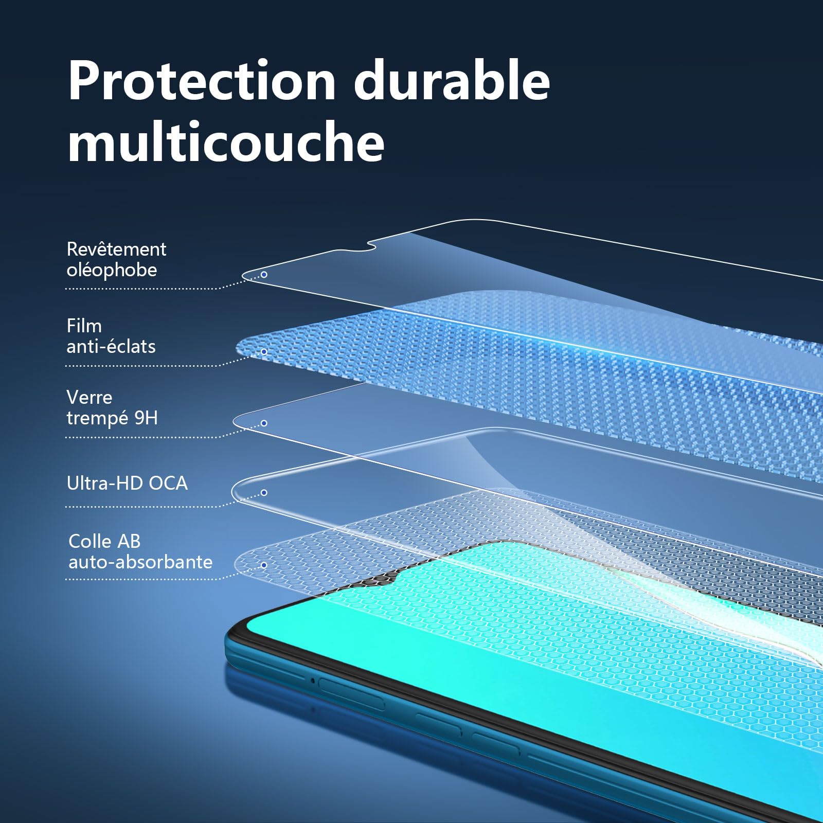 - Oléophobe: il a un revêtement oléophobique qui empêche les empreintes digitales et d’autres contaminants et rend le film facile à nettoyer.