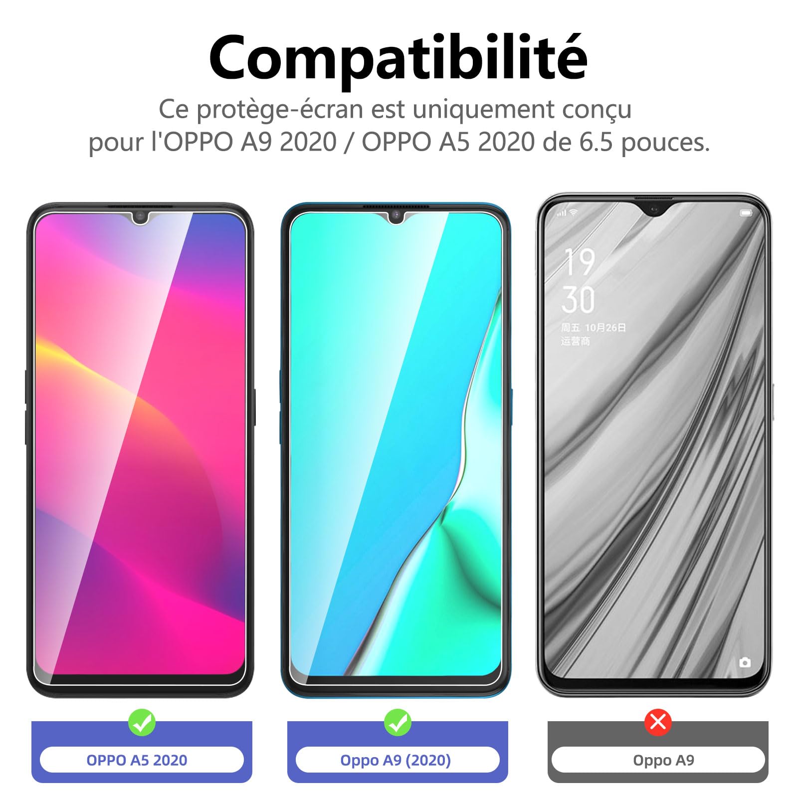 R : Oui, ce Protection d’écran Verre trempé Oppo A9 2020 / Oppo A5 2020 est parfaitement compatible avec : Oppo A9 2020, Oppo A5 2020.