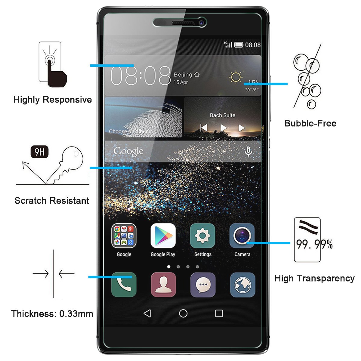 - Protection écran en Verre Trempé Huawei P8 NEW’C , Touche délicate: il est revêtu sur le dos avec un adhésif de silicium solide qui rend l’installation facile et attache le film fermement afin de ne pas influer sur la sensibilité de l’écran tactile