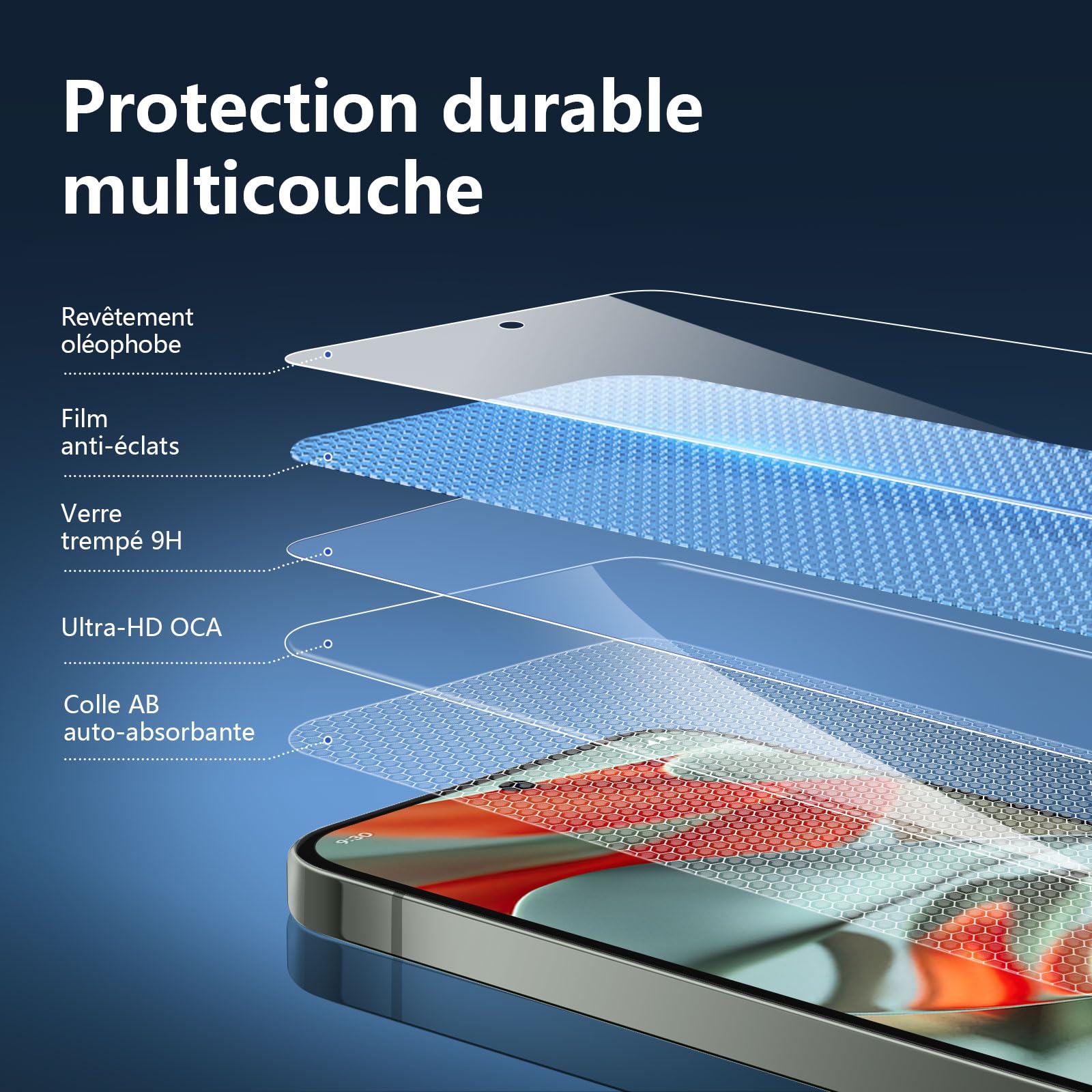 L’installation est un jeu d’enfant grâce à la technologie sans bulles et au revêtement oléophobe qui empêche les empreintes digitales et autres contaminants, rendant le nettoyage du verre très facile. Les bords arrondis assurent une prise en main confortable et une intégration parfaite avec votre appareil.
