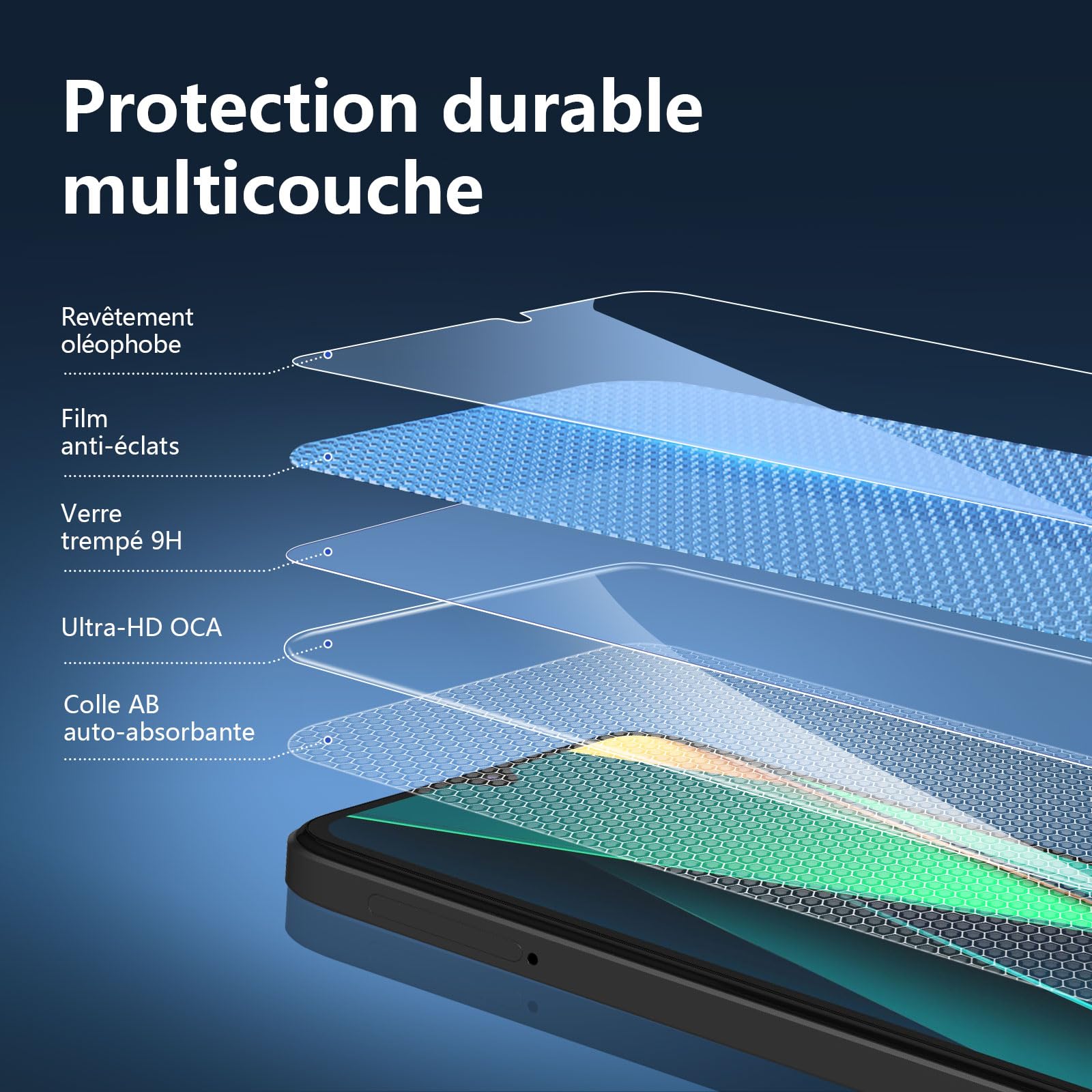 - Oléophobe: un revêtement qui empêche les empreintes digitales et d’autres contaminants et rend le verre très facile à nettoyer. Plus de poussière, un verre trempé super facile à installer et sans bulle.