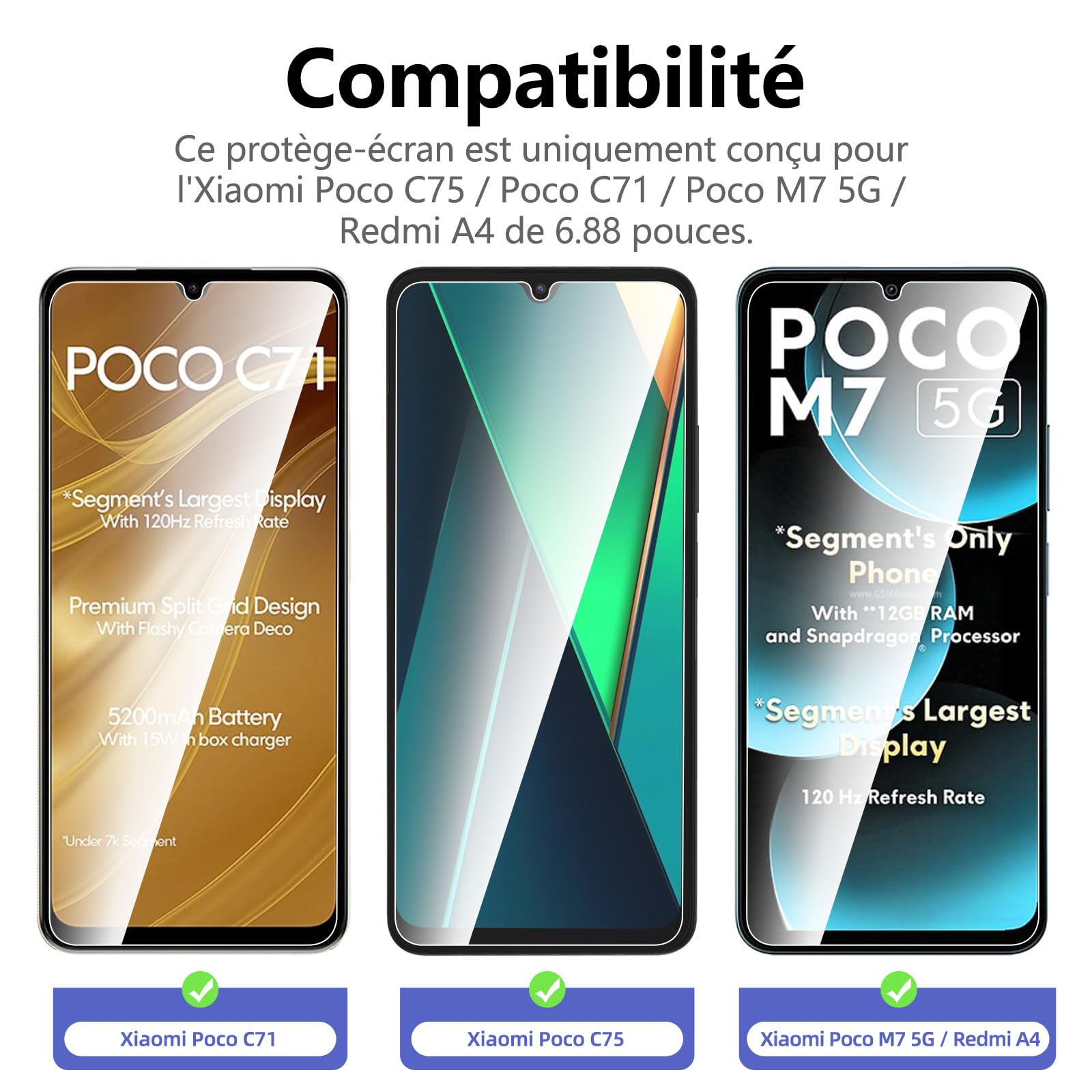 R : Oui, ce Protection d’écran Verre trempé Poco C75 / Poco C71 / Poco M7 5G est parfaitement compatible avec : Poco C75, Poco C71, Poco M7 5G, Redmi A4.
