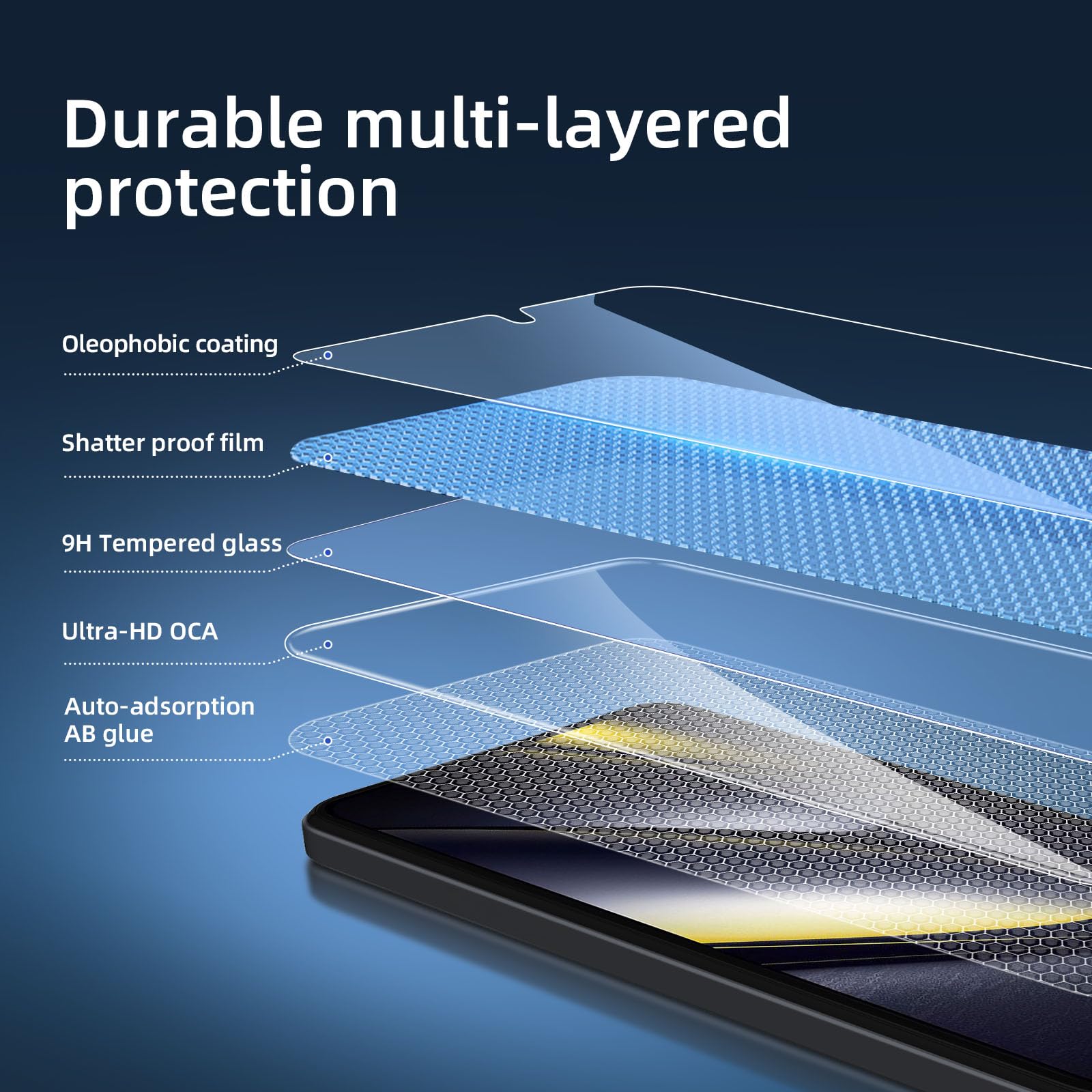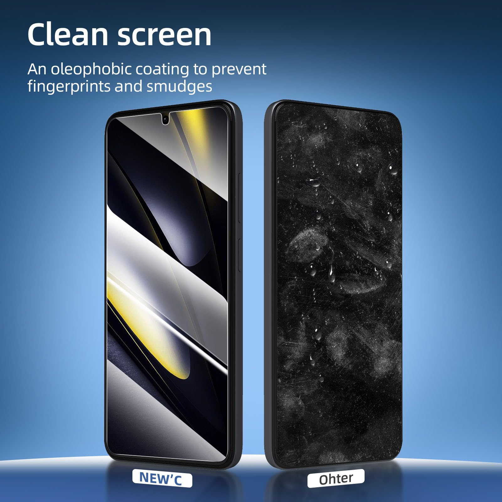 - Oléophobe: un revêtement qui empêche les empreintes digitales et d’autres contaminants et rend le verre très facile à nettoyer. Installation sans poussière, sans empreintes digitales, facile d’une simple pression, sans bulles.