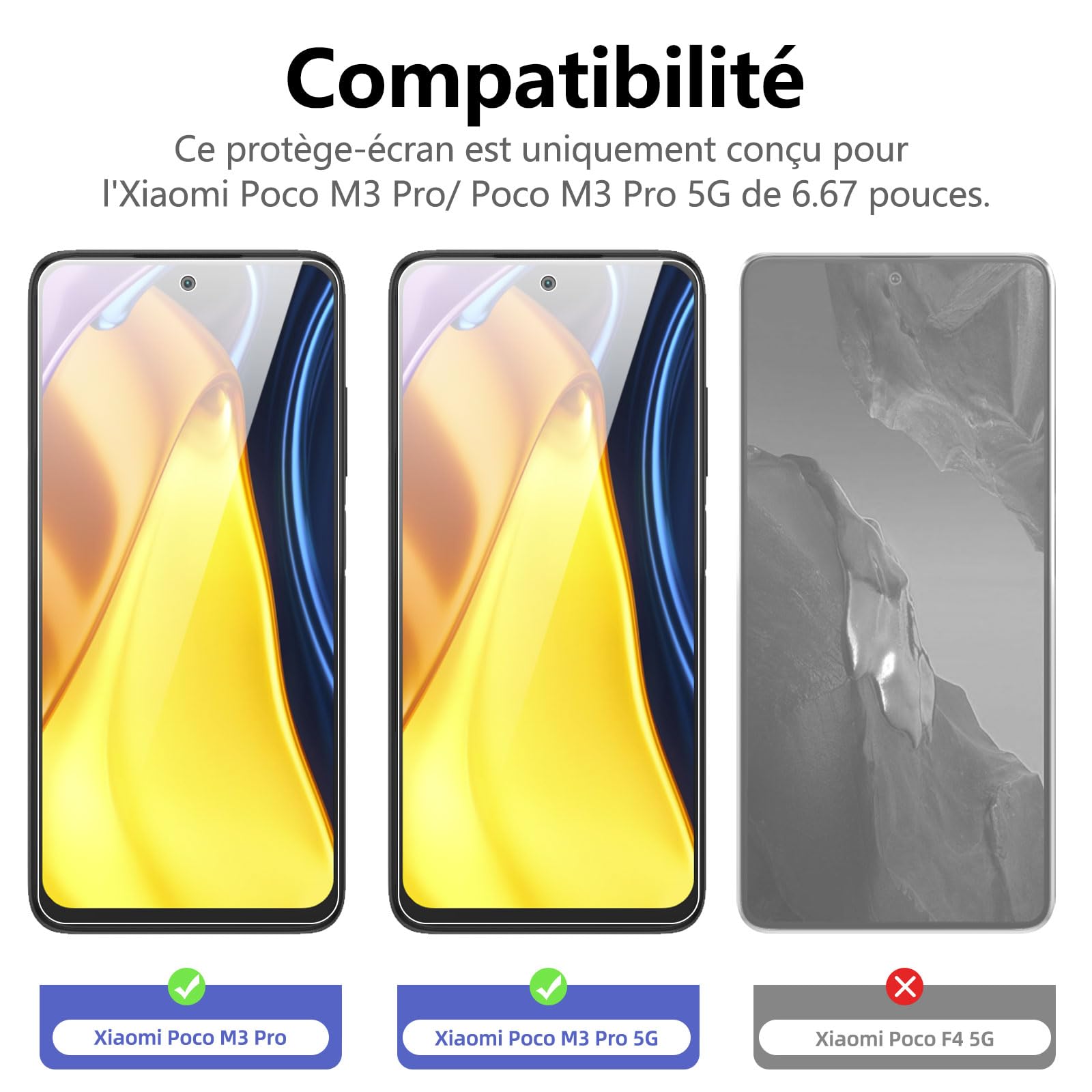 R : Oui, ce Protection d’écran Verre trempé Poco M3 Pro / Poco M3 Pro 5G est parfaitement compatible avec : Poco M3 Pro, Poco M3 Pro 5G.