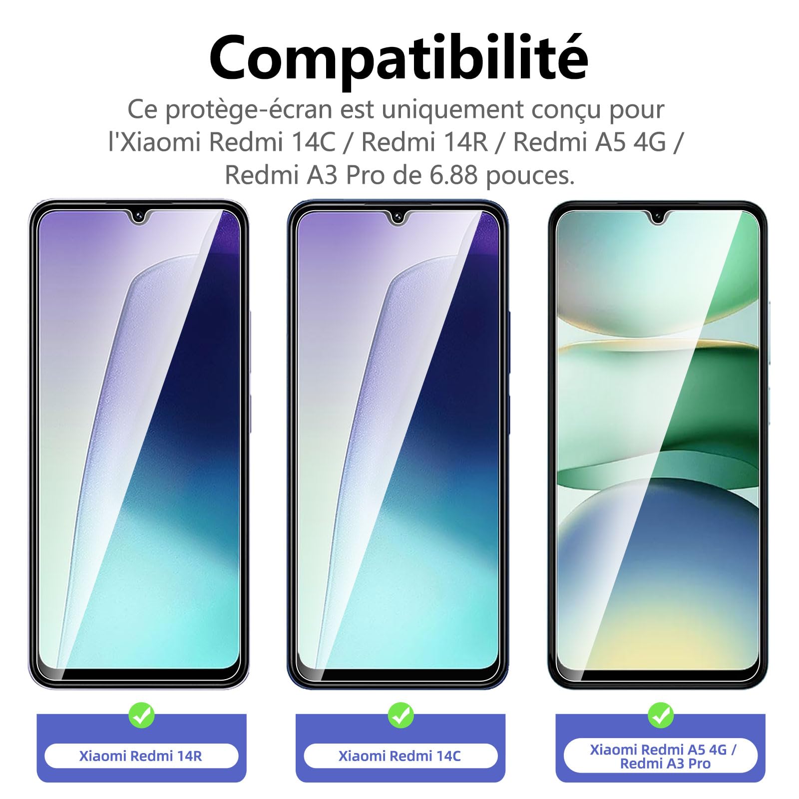 - Lot de 3 Verres Trempés pour Xiaomi Redmi 14C, Redmi 14R, Redmi A5 4G, Redmi A3 Pro. Dureté 9H, résistance aux rayures. Réponse tactile améliorée et super transparent.