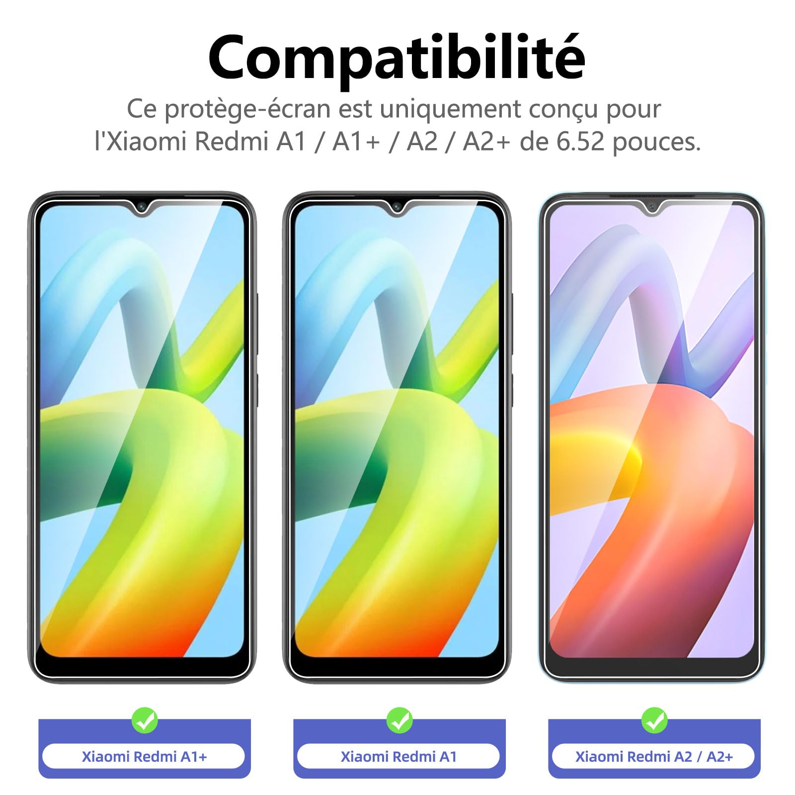 R : Oui, ce Protection d’écran Verre trempé Redmi A1 / Redmi A1+ / Redmi A2 est parfaitement compatible avec : Redmi A1, Redmi A1+, Redmi A2, Redmi A2+.