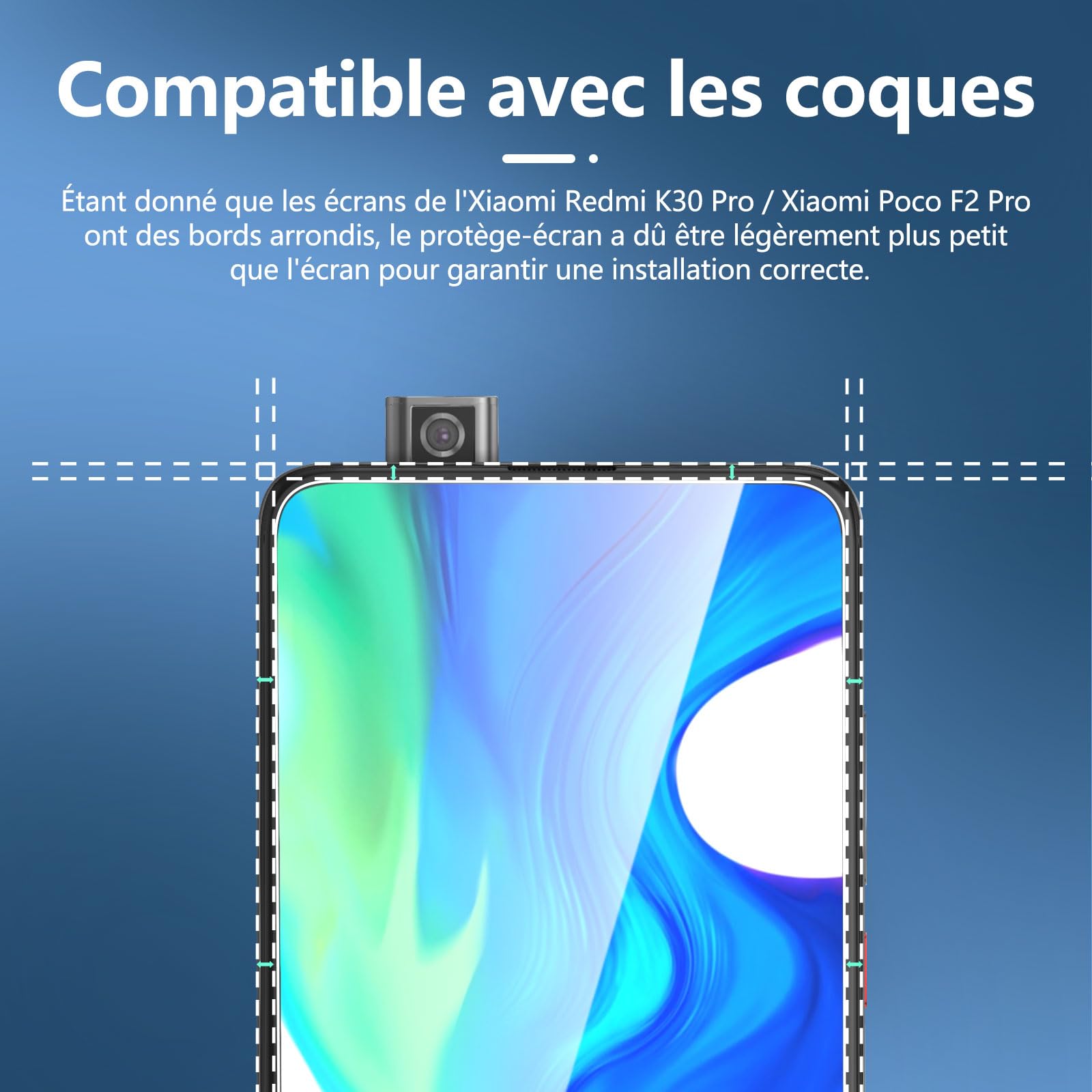 - Pour Xiaomi Redmi K30 Pro, Xiaomi Poco F2 Pro, le verre a été conçus un peu plus grand afin de protéger un maximum l’écran. Cependant dû aux bords arrondis de l’appareil, une infiltration d’air peut se produire. Une pipette fournit permettant de renforcer l’adhésion du verre et bloquer l’infiltration d’air. Ne jamais utiliser sur un appareil déjà abimé ou fissuré. Important: Après utilisation du pipette, il faudra mettre sous le soleil ou la lumière UV obligatoirement pendant au moins 5 à 10s.