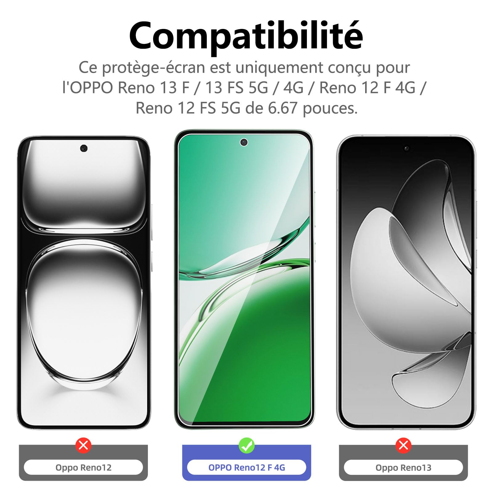 - Lot de 3 Verres Trempés pour OPPO Reno 13 F 5G/4G, Reno 13 FS 5G, Reno12 FS 5G (CPH2637), OPPO Reno12 F 4G (CPH2687). Dureté 9H, résistance aux raillures. Réponse tactile améliorée et super transparent.