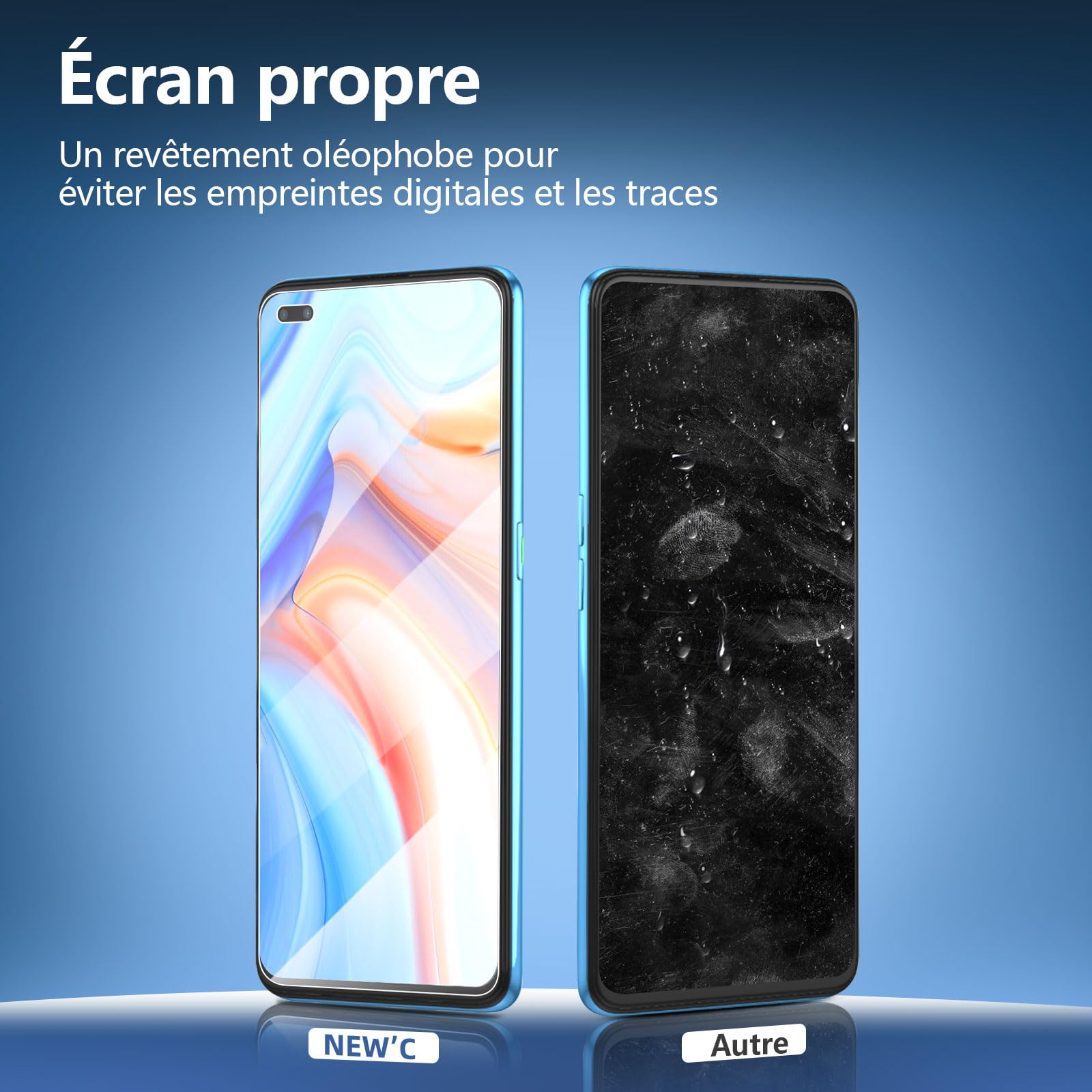 - Oléophobe: il a un revêtement oléophobique qui empêche les empreintes digitales et d’autres contaminants et rend le film facile à nettoyer.