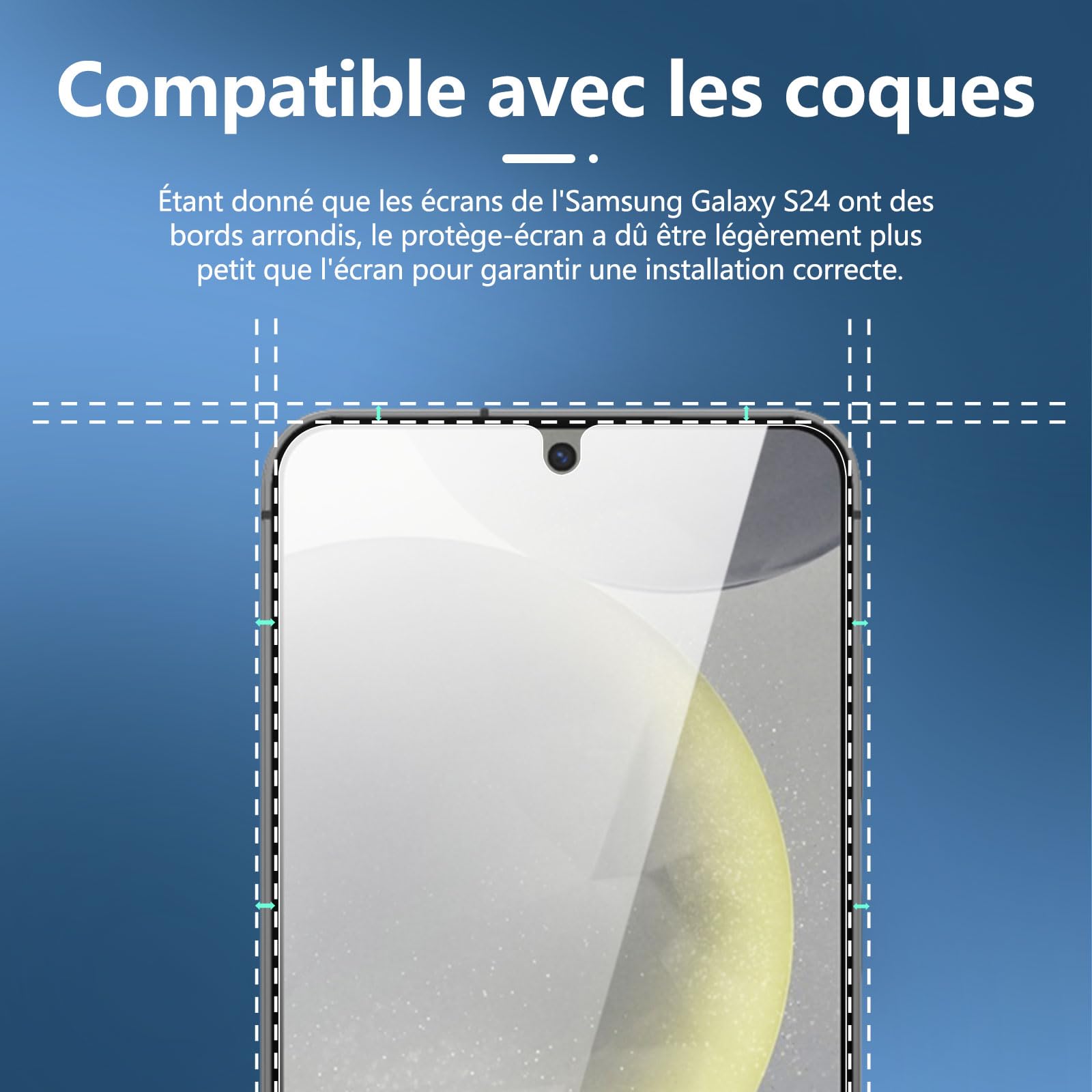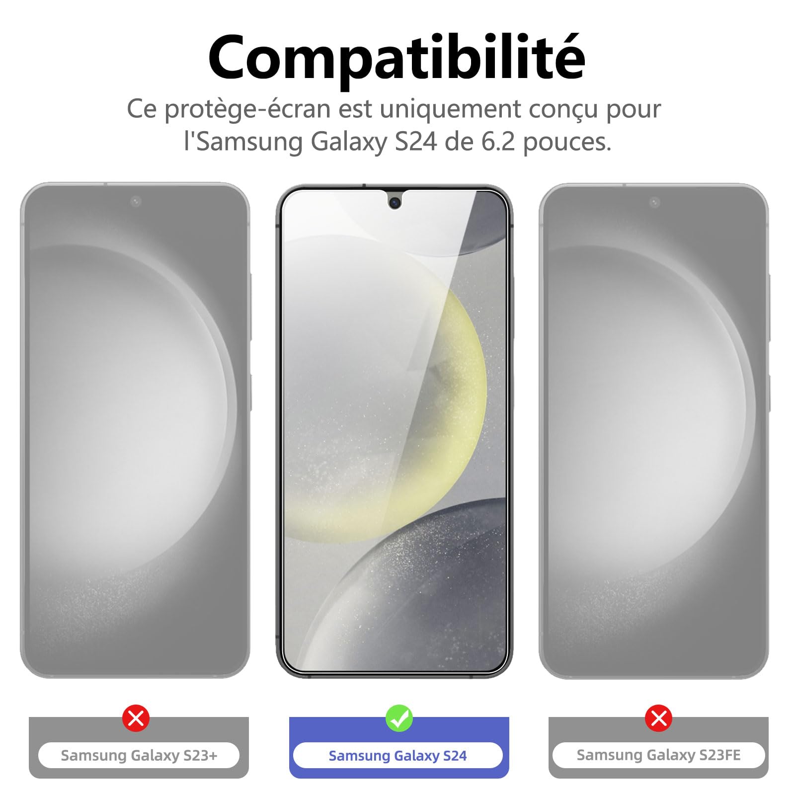 - Protection d’écran en Verre Trempé Samsung Galaxy S24. NEW’C Touche délicate: il est revêtu sur le dos avec un adhésif de silicium solide qui rend l’installation facile et attache le film fermement afin de ne pas influer sur la sensibilité de l’écran tactile.