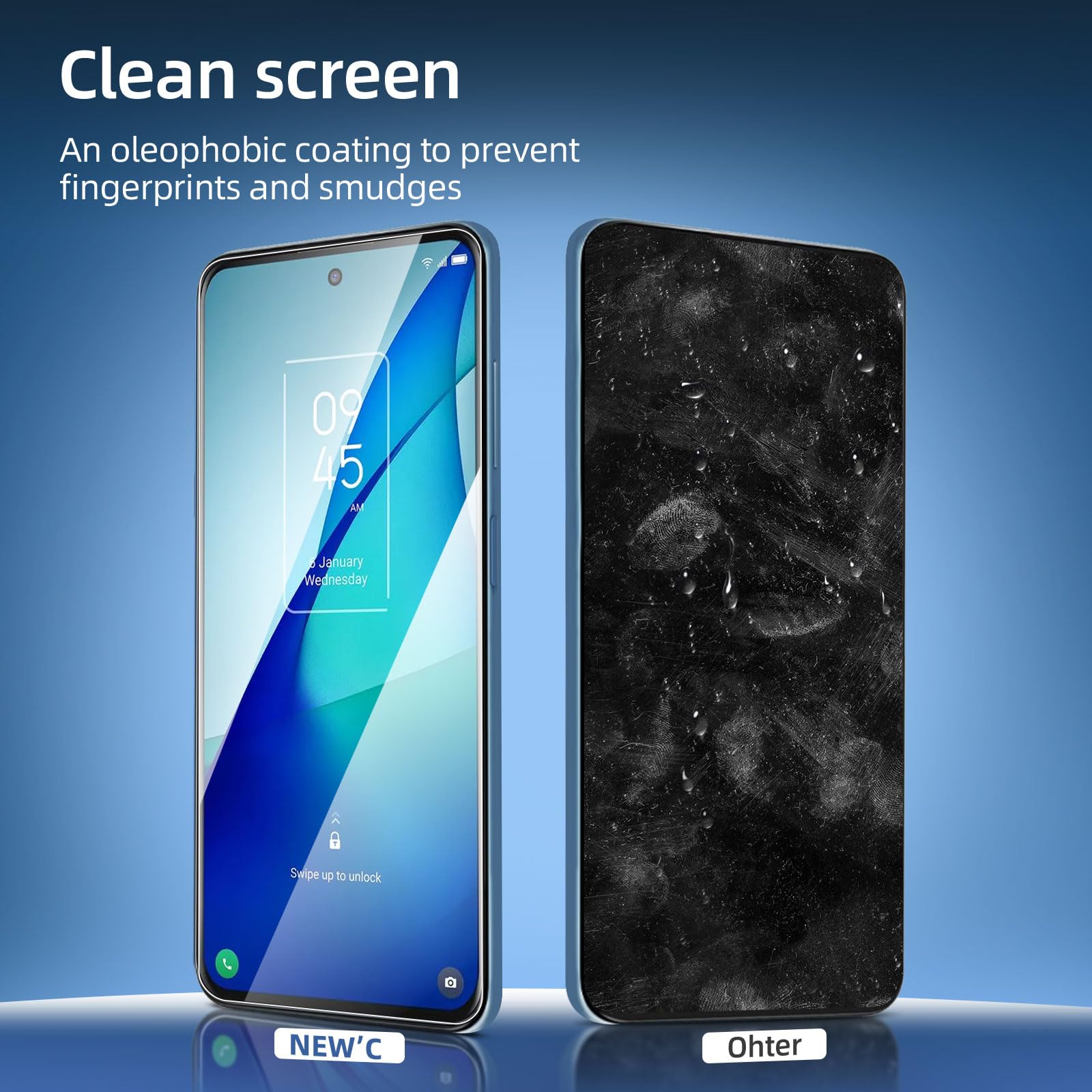 - Installation sans poussière, sans empreintes digitales, facile d’une simple pression, sans bulles.Oléophobe: il a un revêtement oléophobique qui empêche les empreintes digitales et d’autres contaminants et rend le film facile à nettoyer.