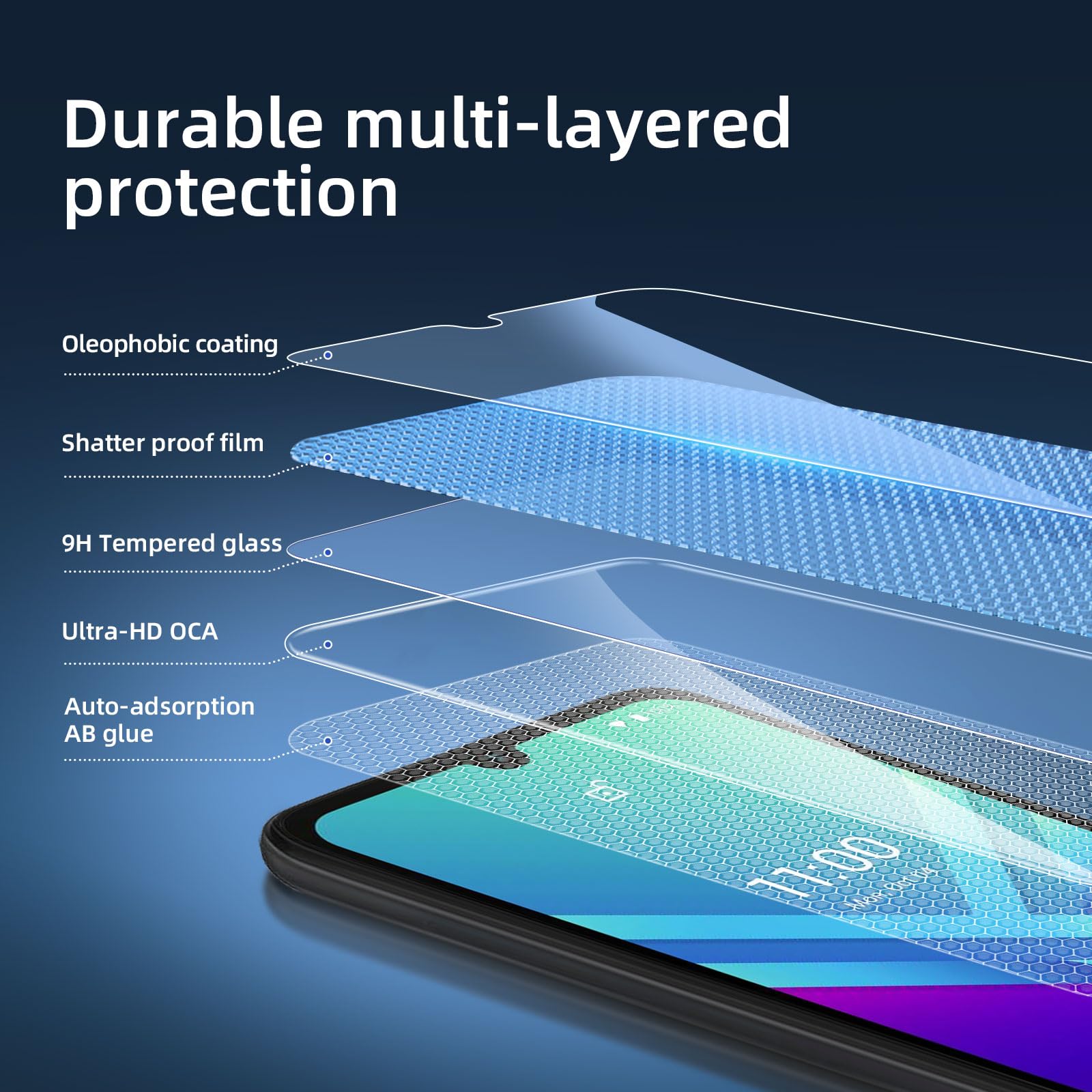 - Installation sans poussière, sans empreintes digitales, facile d’une simple pression, sans bulles.Oléophobe: il a un revêtement oléophobique qui empêche les empreintes digitales et d’autres contaminants et rend le film facile à nettoyer.