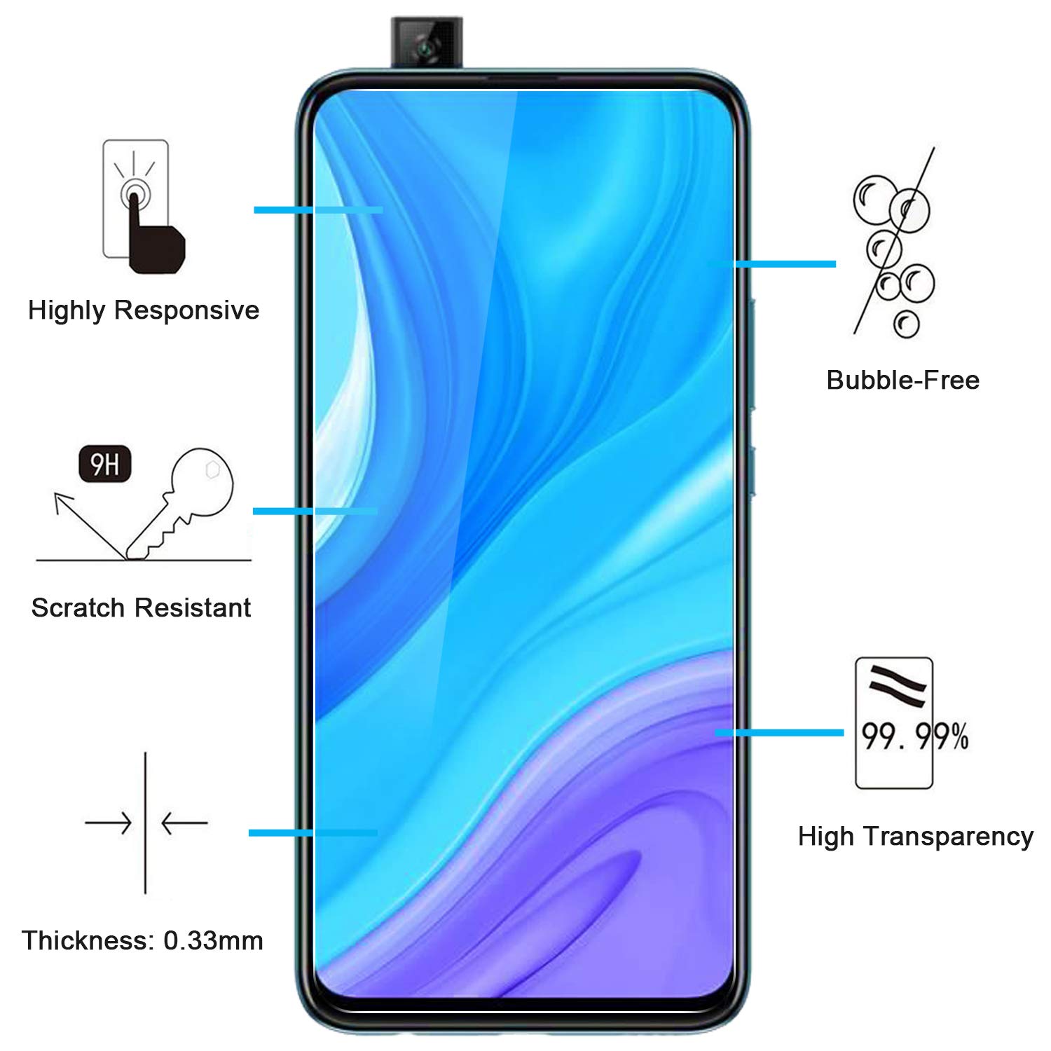 Protection d’écran en verre trempé pour Huawei Y9 Prime 2019 et Enjoy 10 Plus, offrant une dureté de 9H et une épaisseur de 0,33 mm pour une protection optimale.